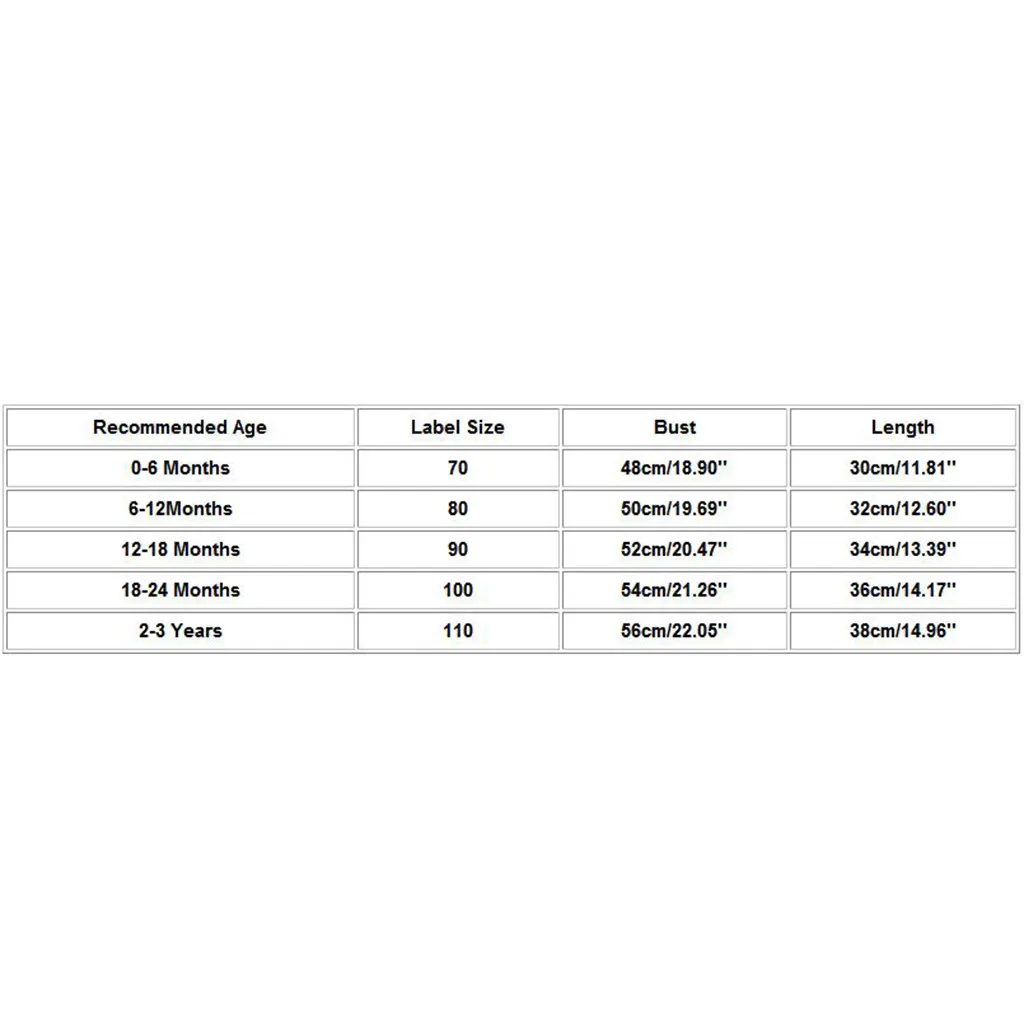 Рекомендуемый возраст Этикетка Размеры Обхват груди Длина Для детей от 0 до 6 месяцев 70 48 см/18,90'' 30 см/11,81'' От 6 до 12 месяцев 80 50 см/19,69'' 32 см/12,60'' 12-18 месяцев 90 52 см/20,47'' 34 см/13,39'' 18-24 месяцев 100 54 см/21,26'' 36 см/14,17'' От 2 до 3 лет 110 56 см/22,05'' 38 см/14,96''