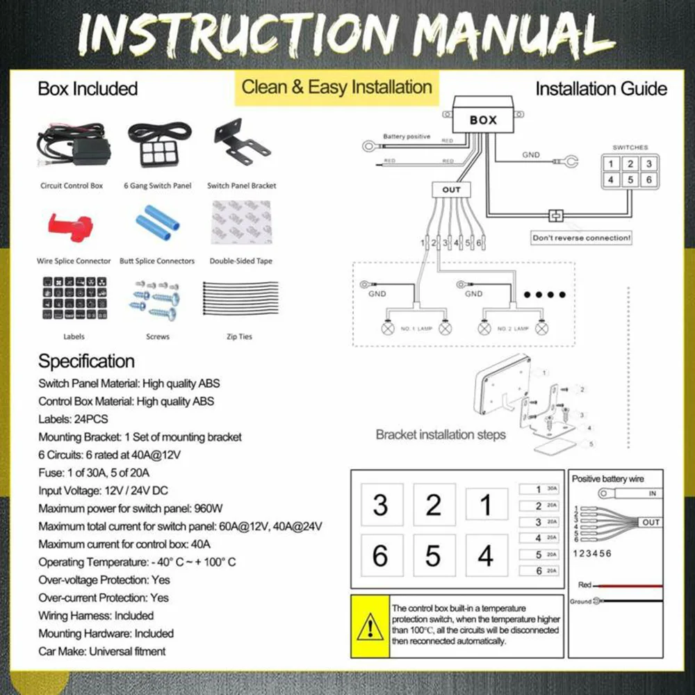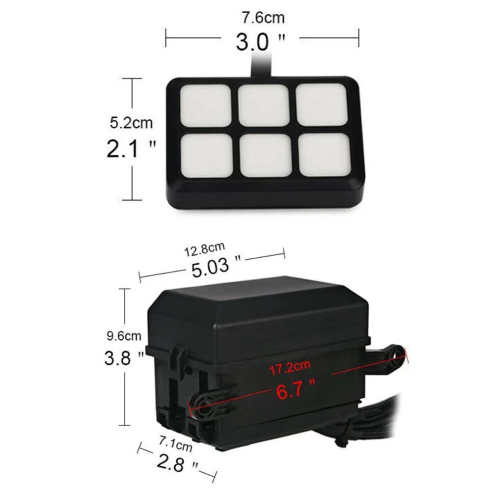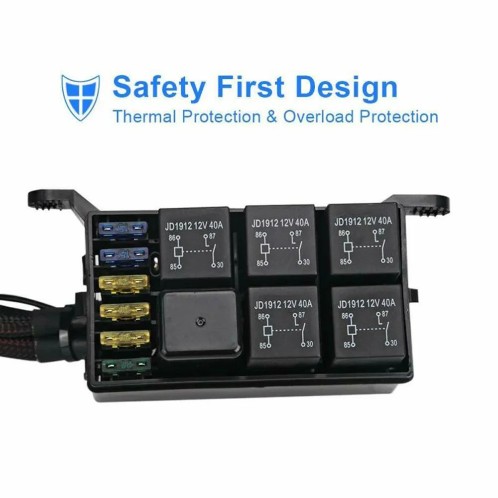 * Коробка оснащена 6 предохранителями, реле и переключателями защиты от температуры. Если температура выше 100 градусов Цельсия, все реле будут автоматически отключены. Вся цепь имеет защиту от перенапряжения, защиту от перегрузки по току и защиту от обратной полярности