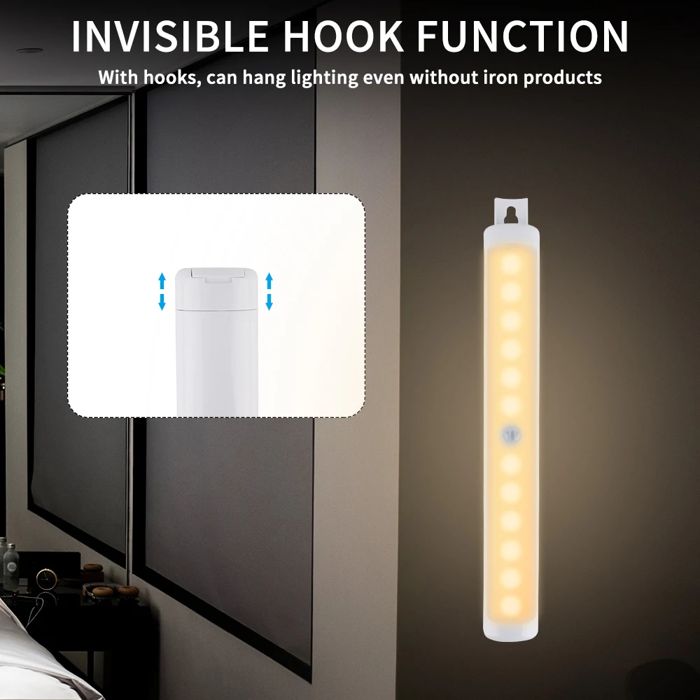 --- Светодиодный светильник с чувствительным датчиком на светильник и ИК-датчиком, работает только в темной среде, автоматически запускается, когда среда Светится автоматически. --- Светильник загорается, когда вы выходите через 20 секунд после того, как вы выходите за пределы его чувствительного диапазона. --- Упаковка поставляется с креплением и 4 съемными крючками, поэтому это не только светильник с датчиком движения, но и настенный крючок, он может выдерживать до 1 кг предметов, таких как одежда, ключи, полотенце, сумка и многое другое. --- Установка по горизонтали и вертикали: обновленная версия, вы можете установить светильник по горизонтали с помощью двусторонней клейкой ленты или винтов (в комплекте), или даже установить вертикально со скрытым висящим отверстием сбоку светильник. --- Высокая яркость, 12 светодиодов обеспечивают достаточный светильник в этой области, и это энергосбережение --- Идеально подходит для спальни, коридоров, гаража, мастерских, подвалов, крытых гаражей, лестниц, дверных проемов, шкафов и других темных мест в вашем доме.