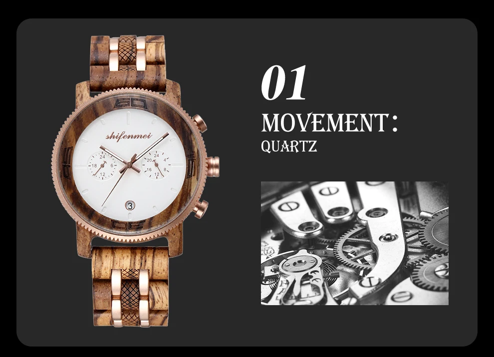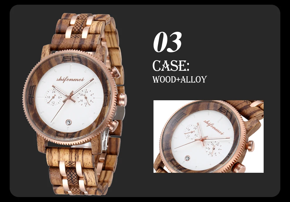 Механизм: Seiko VD32 Зеркало: стекло Чехол: дерево Корпус: нержавеющая сталь Ремешок: дерево Пряжка: Пряжка-бабочка Вес: 82 г Размер Чехла: 45 мм Толщина корпуса: 13 мм Размер ремешка: 250*22 мм W/P: водонепроницаемый