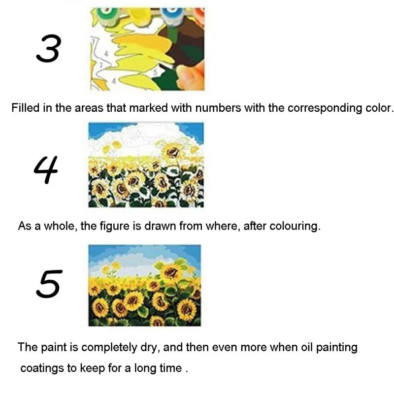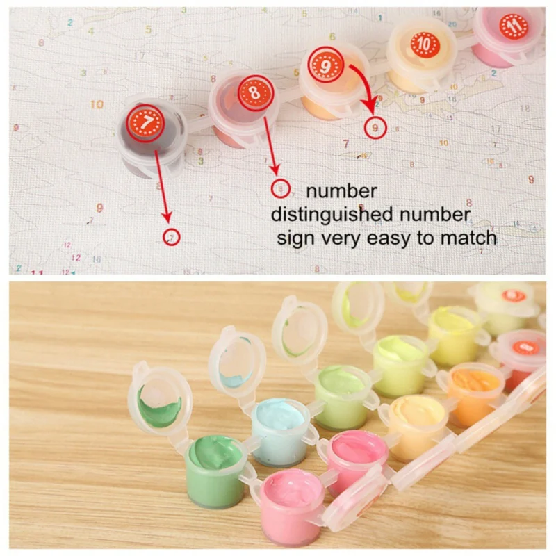 4. Легко раскрашивать, не нужно никаких основных умений живописи, следуйте инструкциям, как показано на изображениях, совпадают номера краски и фигуры на холсте, чтобы заполнить краску.