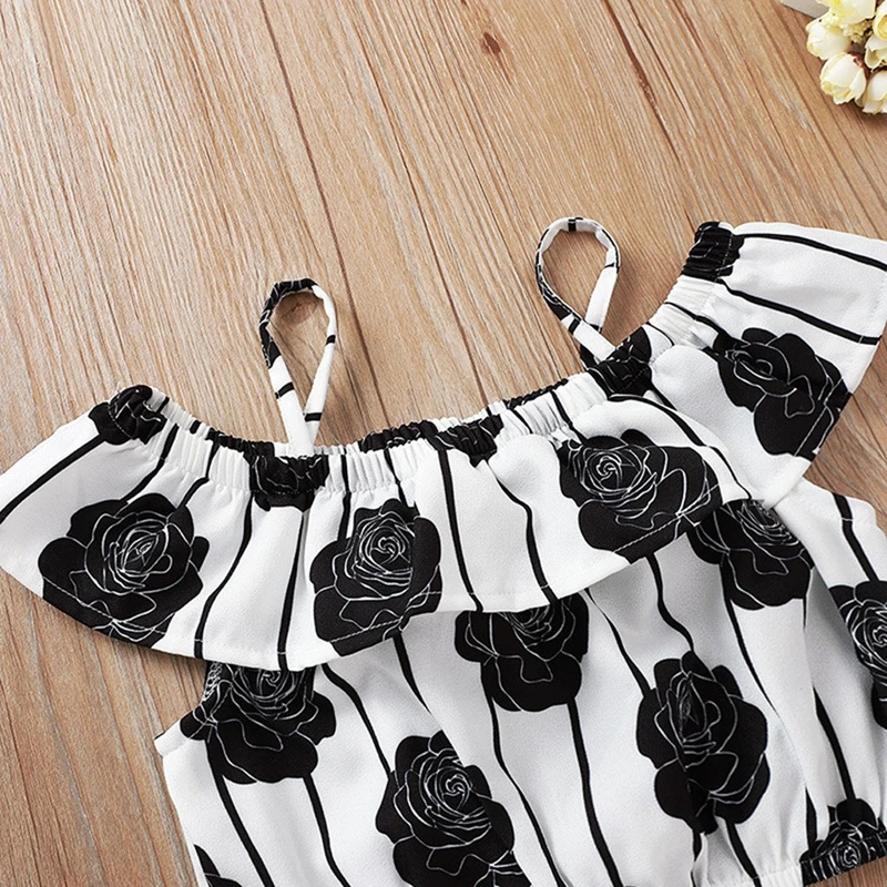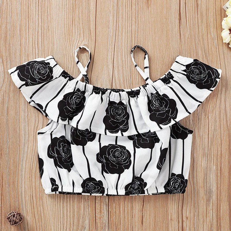 Детская летняя одежда для маленьких девочек с цветочным принтом, с подтяжками, с открытыми плечами, с оборками, топы, с запахом, комплект с юбкой, 2020, модная одежда для девочек