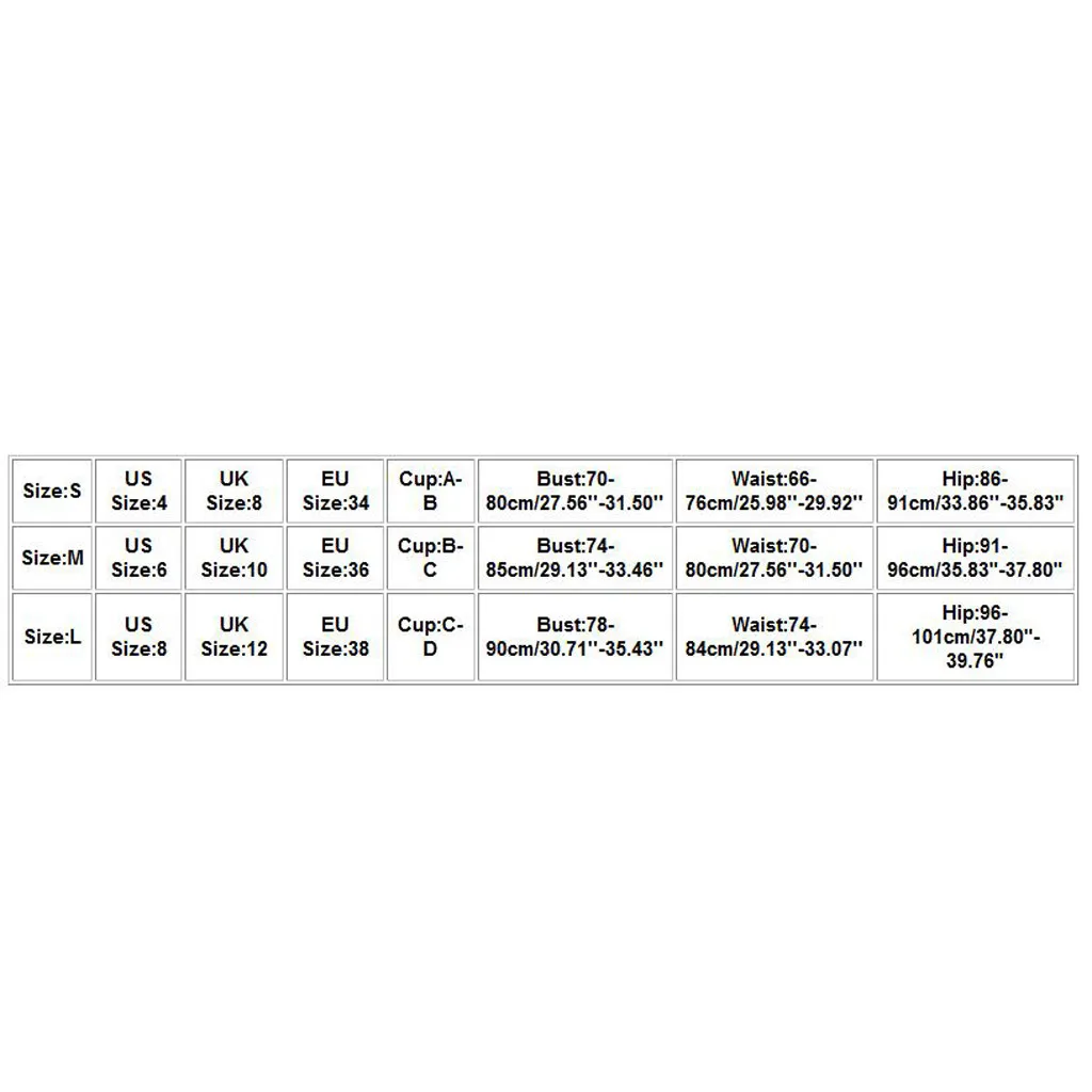 Размеры Нам Размеры UK Размеры ЕС Размеры Чашка Обхват груди Обхват талии Обхват бедер S 4 8 34 A-B 70-80 см/27,56 ''-31,50'' 66-76 см/25,98 ''-29,92'' 86-91 см/33,86 ''-35,83" М 6 10 36 B-C 74-85 см/29,13 ''-33,46'' 70-80 см/27,56 ''-31,50'' 91-96 см/35,83 "-37,80" L 8 12 38 C-D 78-90 см/30,71 ''-35,43'' 74-84 см/29,13 ''-33,07'' 96-101 см/37,80 "-39,76"