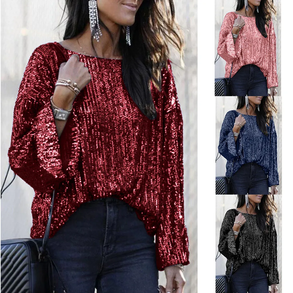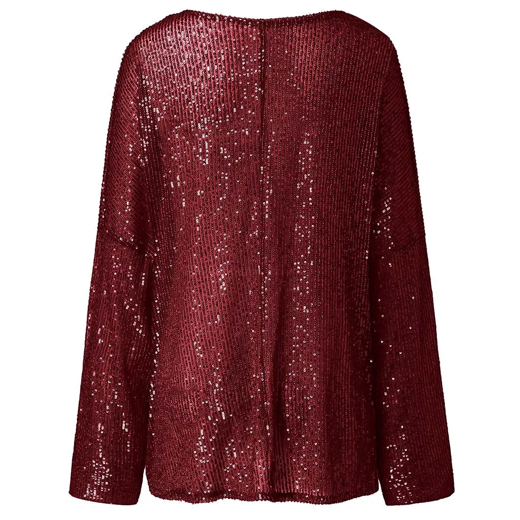Женская футболка с круглым вырезом и длинным рукавом, расшитая блестками, вечерние футболки свободного покроя