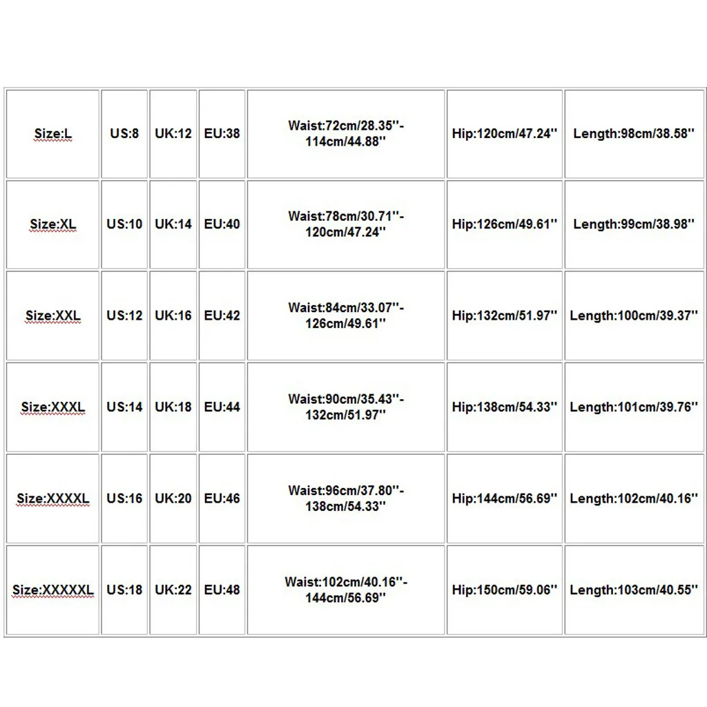 Размер США Великобритания ЕС Талия Бедра Длина L 8 12 38 72 см/28,35 ''-114 см/44,88'' 120 см/47,24'' 98 см/38,58'' XL 10 14 40 78 см/30,71 ''-120 см/47,24'' 126 см/49,61'' 99 см/38,98'' XXL 12 16 42 84 см/33,07 ''-126 см/49,61'' 132 см/51,97'' 100 см/39,37'' XХХL 14 18 44 90 см/35,43 ''-132 см/51,97'' 138 см/54,33'' 101 см/39,76'' XXXXL 16 20 46 96 см/37,80 ''-138 см/54,33'' 144 см/56,69'' 102 см/40,16'' XXXXXL 18 22 48 102 см/40,16 ''-144 см/56,69'' 150 см/59,06'' 103 см/40,55''