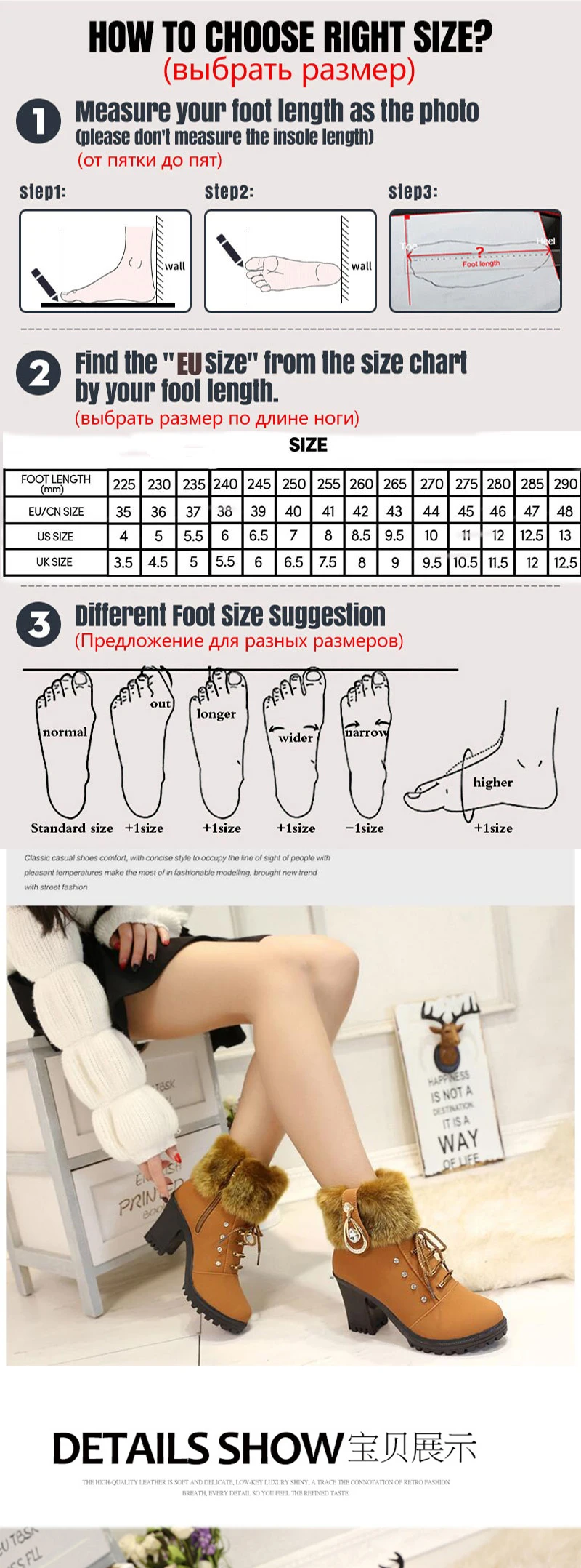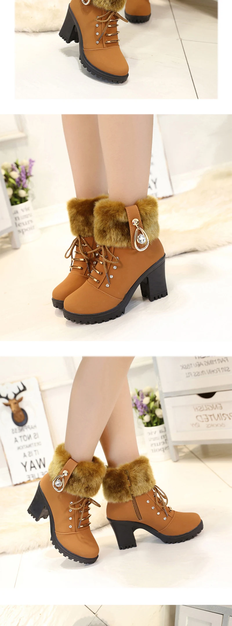 Подходящий возраст: для взрослых Материал верха: замша Материал подошвы: полиуретан Подходящий Пол: Женский Форма Носка: круглый носок Форма каблука: толстый каблук Высота каблука: очень высокий каблук (выше 8 см) Популярные элементы: стразы, водонепроницаемая платформа, металл Функция: водонепроницаемый, теплый Высота голенища: средняя труба Толщина: обычная толщина Как носить: спереди кружево Рисунок: однотонный Подходящие сезоны: осень и зима Материал стельки: короткий плюш Внутренний материал: хлопок Внутренний материал голенища ботинка: короткий плюш Материал голенища: замша Цвет: черный, коричневый Размер: 35,36,37,38,39,40,41