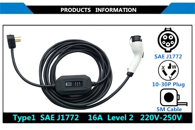 Информация о продукте: • Модель: Тип 1 SAE J1772 • Изделие: портативное зарядное устройство EV • Ток зарядки: 16 А • Входное напряжение: однофазный 220-250 В • Рабочая температура:-30 °C ~ + 50 °C