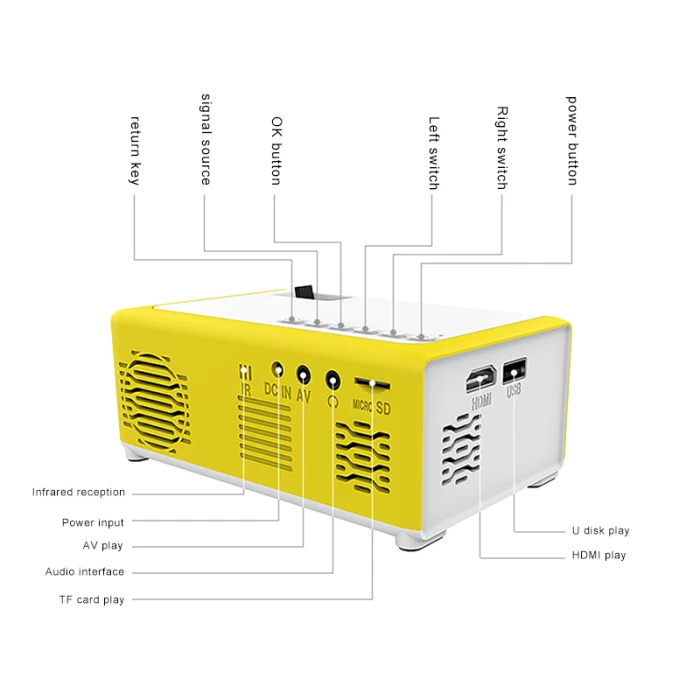 Включает в себя: Проектор host + Пульт ДУ + кабель питания + 3 в 1 аудио-видео кабель + руководство пользователя + коробка