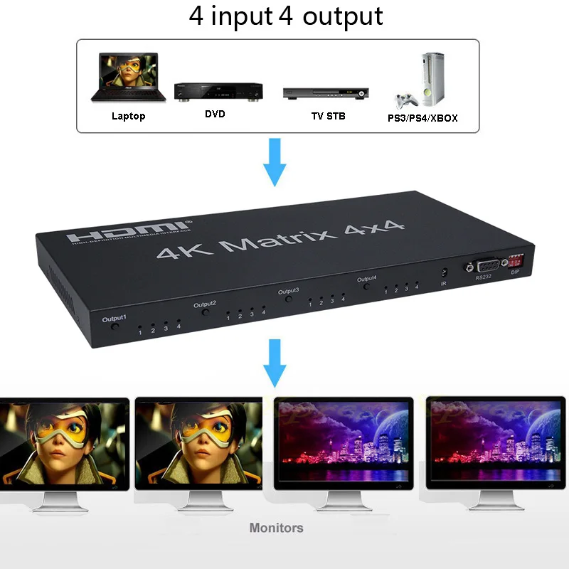 4K 4 на 4 HDMI матрица с 4K x 2K поддерживается, что позволяет HDMI сигнал из любого из четырех источников быть направленным и отображаться на любом из четырех подключенных HDMI дисплеев одновременно. Он поддерживает 3D, 3 Гбит/с, 12-разрядный глубокий Цвет, высокой четкости без потери качества звука и другие особенности определяется HDMI техническими характеристиками. Управление сценариями источника/раковины может быть легко управляется через кнопки на панели, ИК-пульт дистанционного управления, RS-232 или Ethernet управления.
