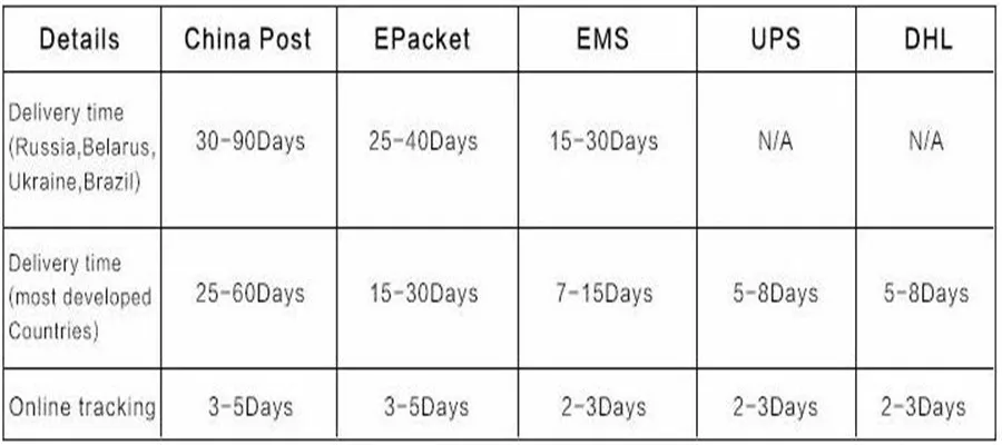 1) Мы принимаем различные виды оплаты. Выше приведены основные способы оплаты, вы можете посмотреть. 2) Aliepxress проверит ваш платеж в течение 24 часов. 3) Все заказы будут обработаны в течение 2-3 рабочих дней после оплаты. 4) обычно мы предлагаем бесплатную доставку Почта Китая зарегистрированной авиапочтой. Здесь мы делаем запрос на время прибытия для вашей справки, Пожалуйста, посмотрите, прежде чем делать заказ. 5) для оптового покупателя, если сумма вашего заказа соответствует $150, мы предлагаем бесплатную доставку Экспресс-FedEx, DHL, EMS, Aramex. Информация об этом, пожалуйста, свяжитесь с нами напрямую. 6) все покупатели должны оплатить Любой дополнительный налог на импорт. Пожалуйста, обратите внимание, когда делаете заказ.