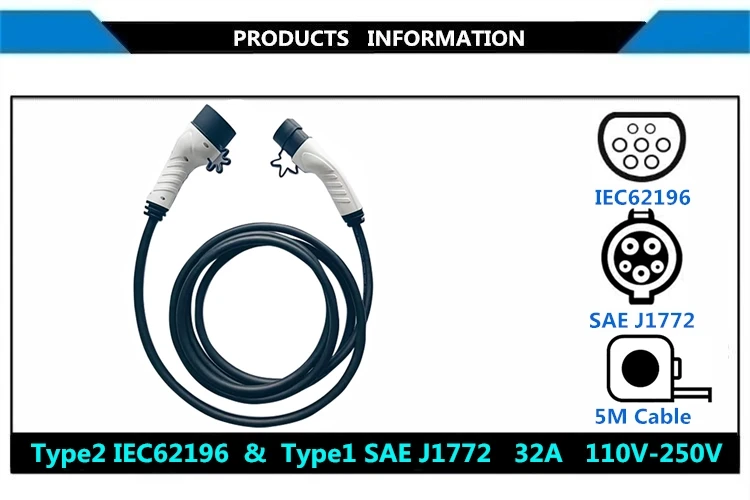 Информация о продукте: • Модель 1: Тип 1 SAE J1772 • Модель 2: Тип 2 IEC62196-2 • Изделие: Тип 1, Тип 2 • Ток зарядки: 32 А • Входное напряжение: однофазный 110-250 В • Рабочая температура: -30 °C ~ + 50 °C