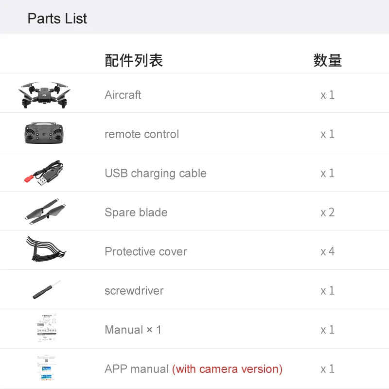 1 х летательный аппарат 1 х пульт дистанционного управления 1 x камера (базовая версия не включена) 2 х Пропеллер 1 x литий Батарея Зарядный кабель-1 шт.;