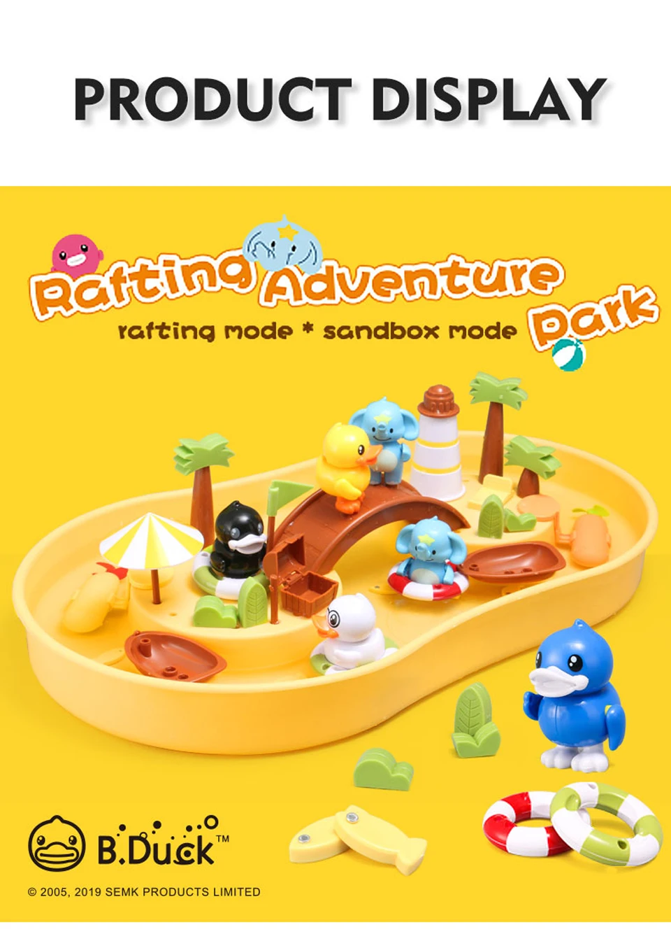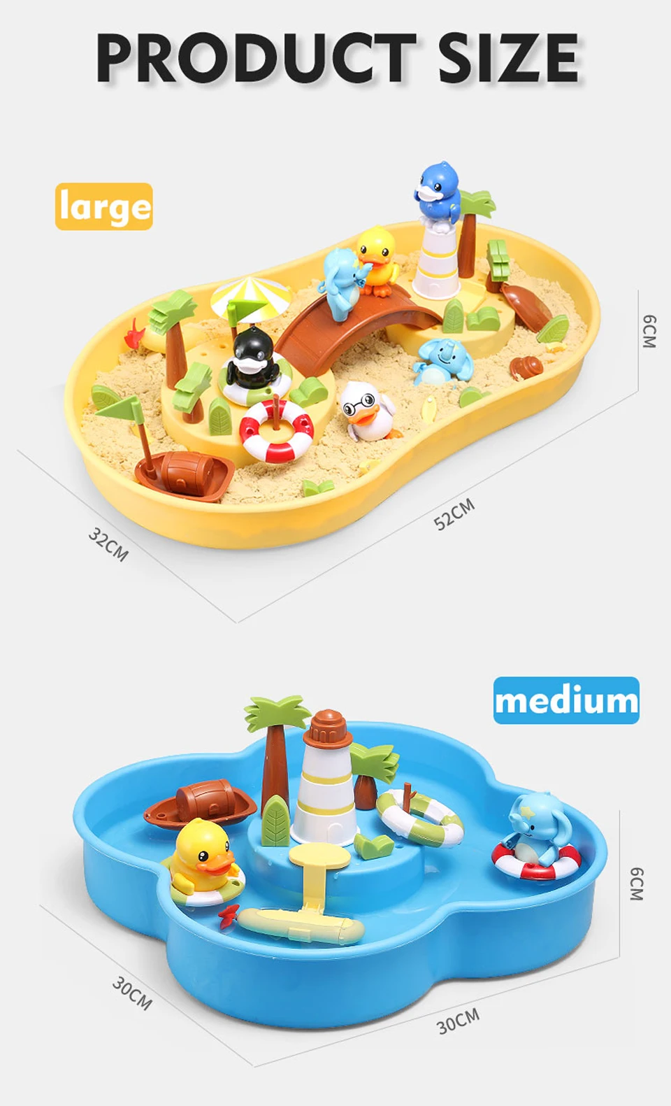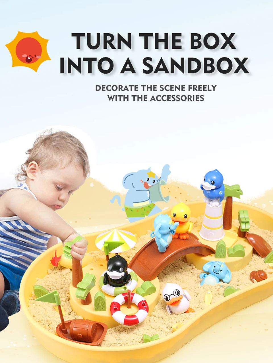 1 коробка (залейте воду или песок) 1 удочка (с магнитом) 4 фигурки (с магнитами сверху) и плавательные кольца 8 маленьких рыб (с магнитами) 2 плавающие пчелы (с магнитами) 1 подводная лодка (требуется 1 батарейка ААА) 1 Песок строительный пресс-форм Несколько украшения 1 Руководство пользователя