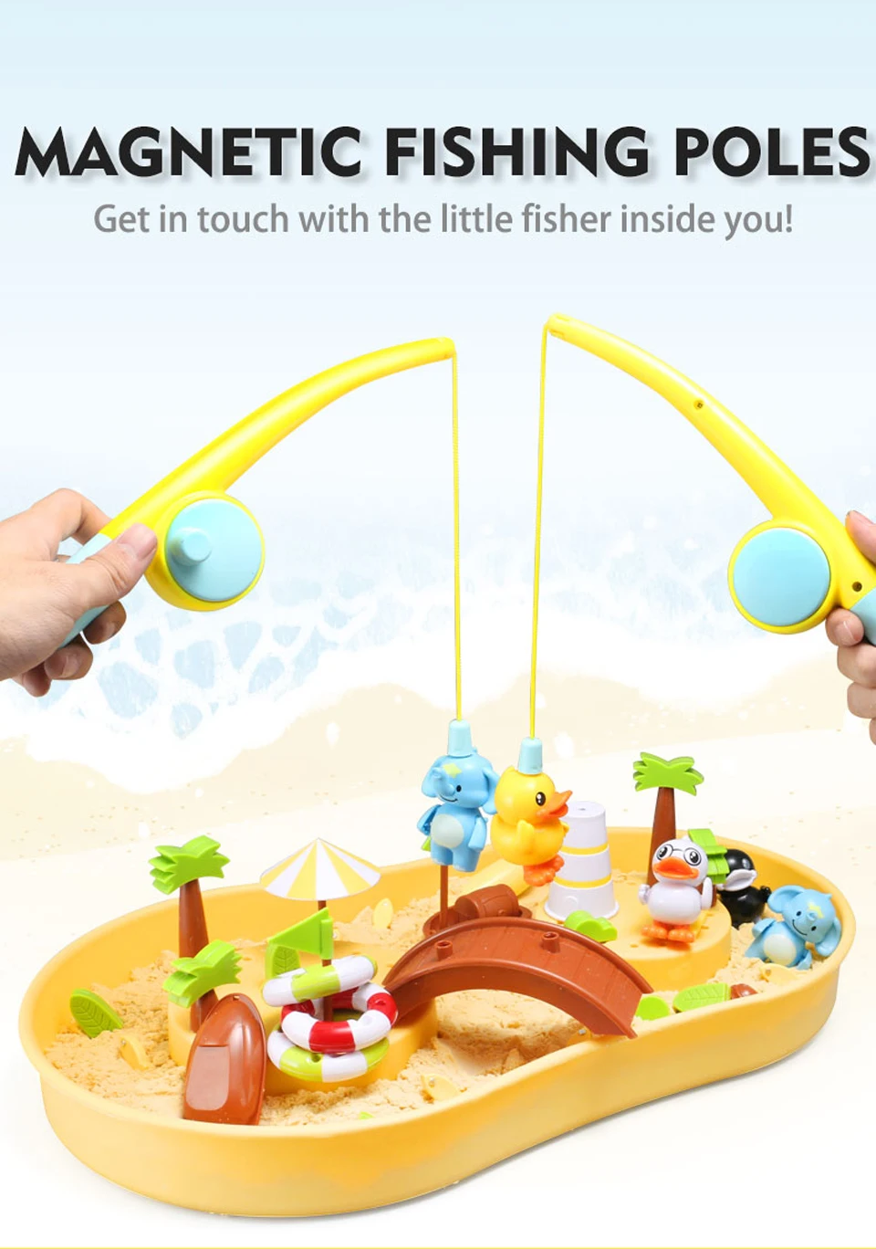 1 коробка (залейте воду или песок) 2 Удочки (с магнитами) 6 фигурок (с магнитами сверху) и плавательные кольца 8 маленьких рыб (с магнитами) 2 плавающие пчелы (с магнитами) 2 подводные лодки (для каждой требуется 1 батарейка ААА) 2 Песка строительного пресс-формы Несколько украшения 1 Руководство пользователя