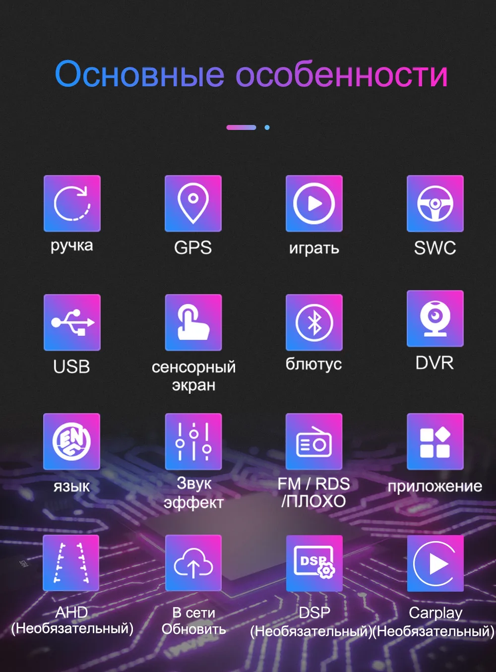 ОС: Операционная система Android RAM + ROM: 2G + 16G 2G + 32G 2G + 64G Поскольку система занимает внутреннюю память, операционная система занимает около 4-6 ГБ памяти. Бесплатная установка карта ЦП: четырехъядерный Поддержка изменения логотипа, пароль заводского набора: 8888, изменение логотипа Разъем питания: подключи и работай Встроенный GPS -Поддержка 2D HD и 3D карт Разрешение: 2.5D HD 1024*600 пикселей емкостный экран --- Поддержка внешнего мобильного u-диска и жесткого диска FAT32 (без ограничения емкости) --- Интернет развлечения, встроенный WiFi модуль. --- Поддержка HD 1080p видеоигр, поддержка зеркального соединения и Airplay. --- Радио: FM / AM-Radio с 30 предустановленными станциями Функция двойной зоны (пользователь может слушать музыку или радио в режиме gps-навигации) --- Встроенный Bluetooth handsfree и телефонная книга, поддержка A2DP, воспроизведение музыки напрямую по телефону. (Вы должны согласиться с авторизацией телефона и синхронизировать контактную информацию в настройках телефона) Совместимость с управлением рулевого колеса Электронная и механическая Противоударная система --- Высокомощный стерео аудио выход, поддерживает 4 динамика ---- Поддержка AHD 1080P вход камеры заднего вида Обратите внимание: эта модель не имеет функции DVD / CD, но поддерживает жесткий диск мобильного USB / U диска.