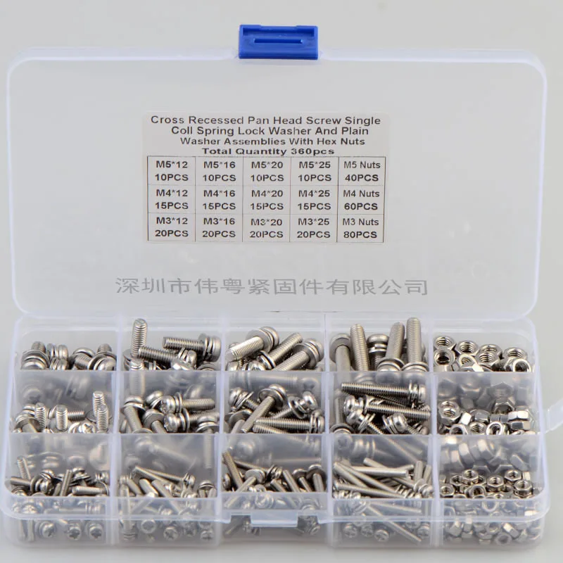 Размер коробки: 17,6*10,2*2,3 см 360 шт. M3 M4 M5 нержавеющая сталь 304 крестообразная головка Тройная комбинация с плоской прокладкой, пружинная прокладка набор проводов с винтом A2-9074 вес нетто продукта: 564 г M3 x 12 20 штук M4 x 12, 15 шт. ----------------------