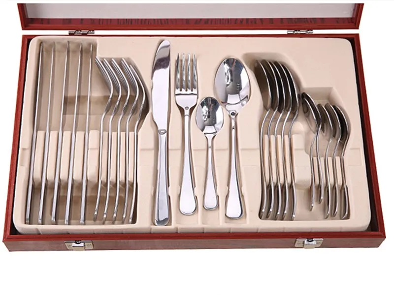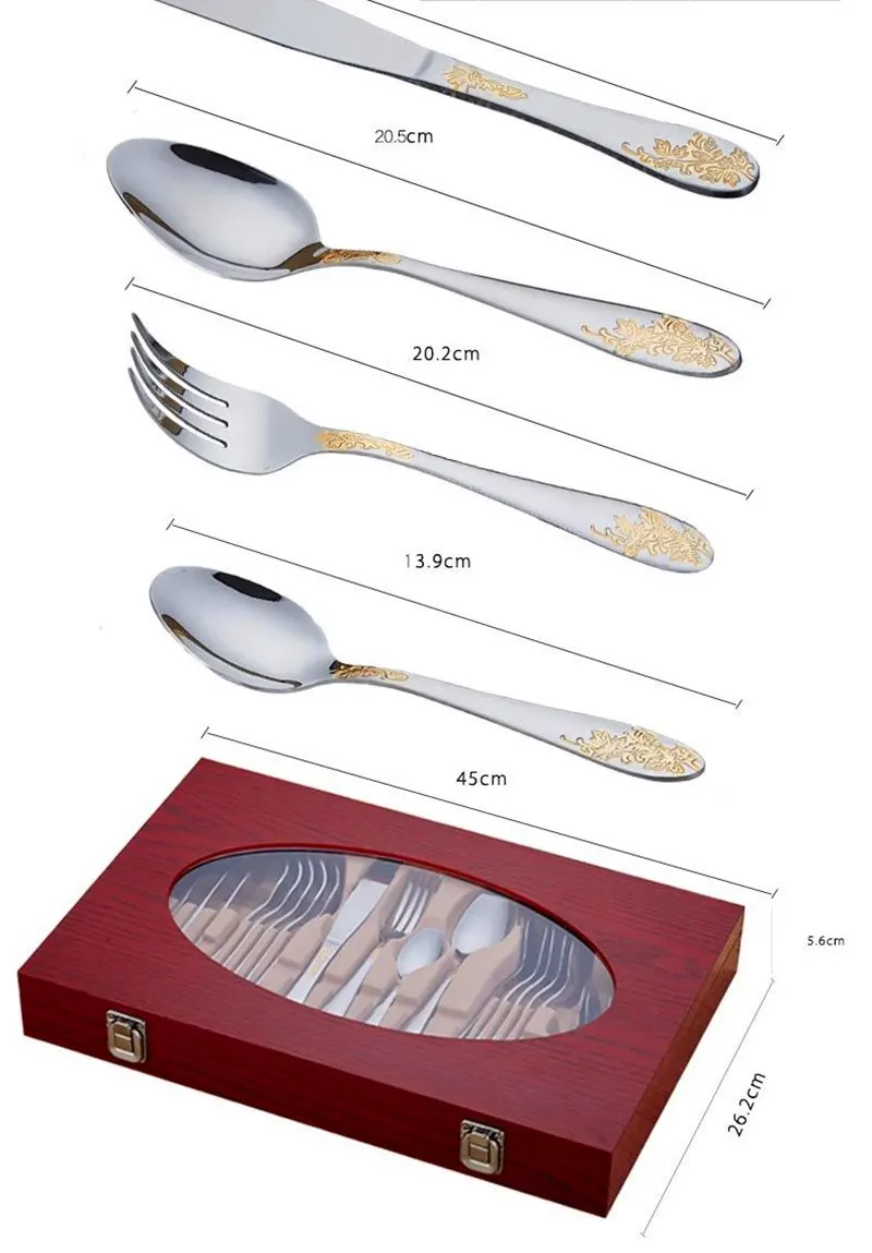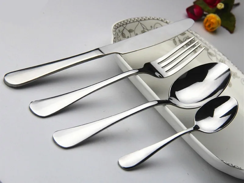 Подробности: Стиль: Западный Материал: 410 нержавеющая сталь Цвет: серебристый цвет, набор столовых приборов Размер: Ножи: 23 см x 2 см Ложки: 20,3 см x 4,4 см Вилки: 20,5 см x 2,5 см