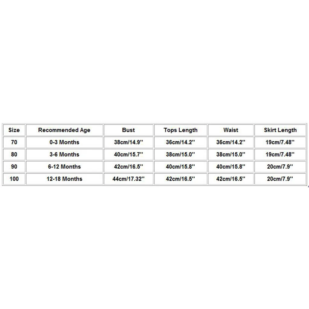 Размер Рекомендуемый возраст Бюст Длина топа Талия Длина юбки 70 0-3 месяца 38 см/14,9'' 36 см/14,2'' 36 см/14,2'' 19 см/7,48'' 80 3-6 месяцев 40 см/15,7'' 38 см/15,0'' 38 см/15,0'' 19 см/7,48'' 90 6-12 месяцев 42 см/16,5 дюйма 40 см/15,8'' 40 см/15,8'' 20 см/7,9 дюйма 100 12-18 месяцев 44 см/17,32'' 42 см/16,5 дюйма 42 см/16,5 дюйма 20 см/7,9 дюйма