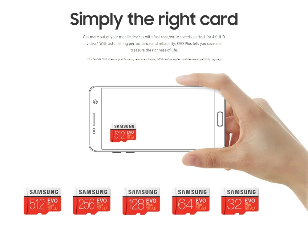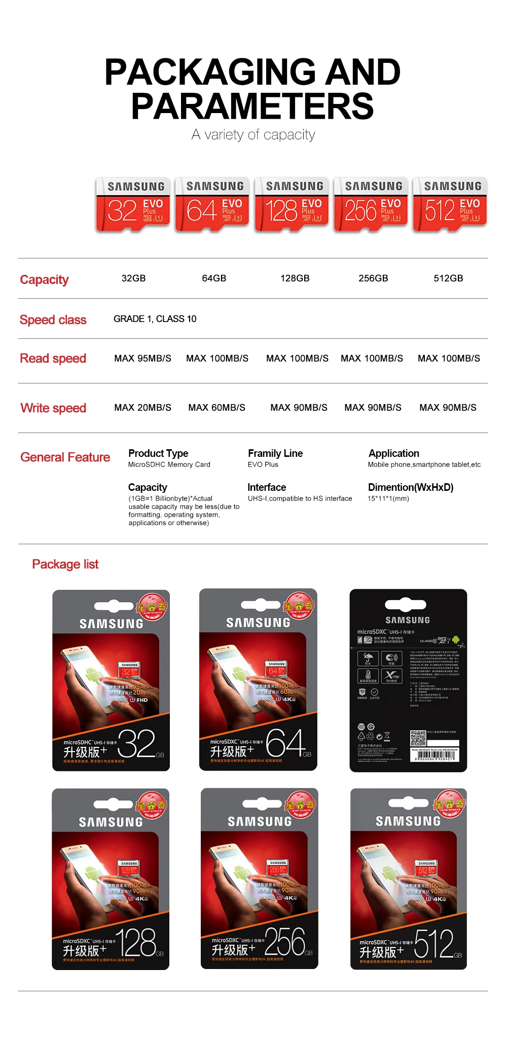 Особенности: EVO 16 Гб U1 класс 10, максимальная скорость чтения до 48 МБ/с./с = SDHC Новый EVO + 32 ГБ U1 Class10 скорость = максимальная скорость чтения до 95 МБ/с. = SDHC Новый скорость EVO + 64 Гб U3 Class10 скорость = максимальная скорость чтения до 100 МБ/с. = SDXC Новый EVO + 128 Гб U3 Class10 скорость = максимальная скорость чтения до 100 МБ/с. = SDXC Новый EVO + 256 ГБ U3 Class10 скорость = максимальная скорость чтения до 100 МБ/с. = SDXC О емкости: 16 Гб = приблизительно 14-15 ГБ 32 Гб = приблизительно 28-30 Гб 64 ГБ = приблизительно 58-60 Гб 128 ГБ = Приблизительно 115-119 ГБ 256 ГБ = приблизительно 230-238 ГБ Советы: Как проверить Ёмкость и Скорость карты памяти? 1). Для проверки всех карт памяти с помощью H2testw на ПК, Используйте качественный картридер USB 3,0. Реальная карта памяти не должна пропускать H2testw. 2). Пожалуйста, не используйте дешевый кард-ридер для тестирования карты Micro SD, скорость карты Micro SD будет снижена с помощью картридера низкого качества. 3). На скорость карты памяти Micro SD влияет картридер и емкость, которую вы выбираете, usb-порт и т. Д. Устройство с низким качеством 100% замедлит скорость карты, 1 Мб = 1000 КБ. Обратите внимание: 1. Наш магазин предлагает 100% оригинальные товары. 2. Все продукты соответствуют официальным веб-сайтам SAMSUNG. 3. Производитель оставляет за собой право по своему выбору менять или модифицировать продукты. Внешний вид и дизайн упаковки могут меняться без предварительного уведомления. 4. Мы не несем ответственность за любые изменения или модификации, которые производит на продукты.