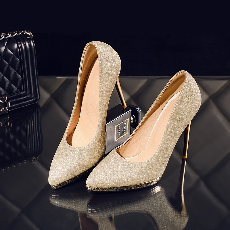Оригинальные новые элегантные туфли-лодочки с блестками; Цвет Фиолетовый, золотистый, Серебристый; Женские пикантные вечерние туфли с острым носком на высоком металлическом каблуке-шпильке. Пожалуйста, используйте нашу таблицу размеров при выборе размера. Высота каблука: около 12,5 см Высота платформы: 1 см