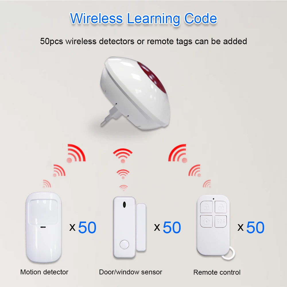 Сирена будет сразу же звучать в громком 110 дБ, как только срабатывает какой-либо беспроводной детектор, светильник мигает, чтобы шокировать незаконный/незваный нарушитель.
