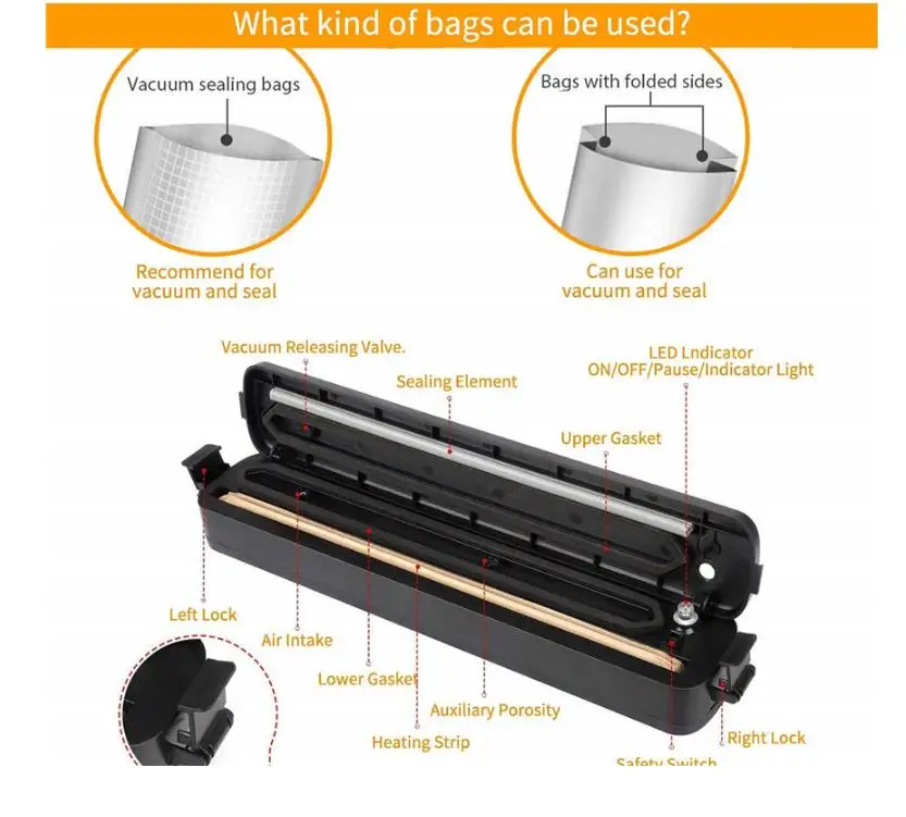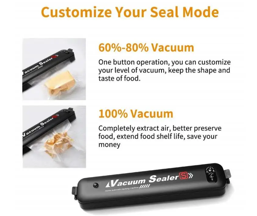 Параметры: Номинальное напряжение: 110-220 В/50-60 Гц Номинальная мощность: 90 Вт Длина уплотнения: 27 см Размеры: 387x140x70mm Размер упаковочной цветной коробки: 37,5*7,3*9,5 см Время вакуумной герметизации: 10 ~ 20 с (время откачки пропорционально объему откачки) Посылка включает в себя: 1 шт. * вакуумный упаковщик еды 15 шт. * сумки (Размер: 15 шт. 20*25 см) 1 шт. * Шнур питания 1 шт. * Руководство пользователя на английском языке