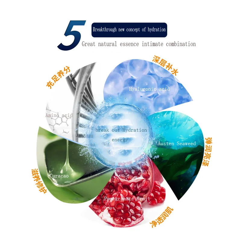 Отличная натуральная эссенция Интимная комбинация Взрыв энергии гидратации Гиалуроновая кислота Аминокислоты Водоросли Кюрасао Фрукты граната