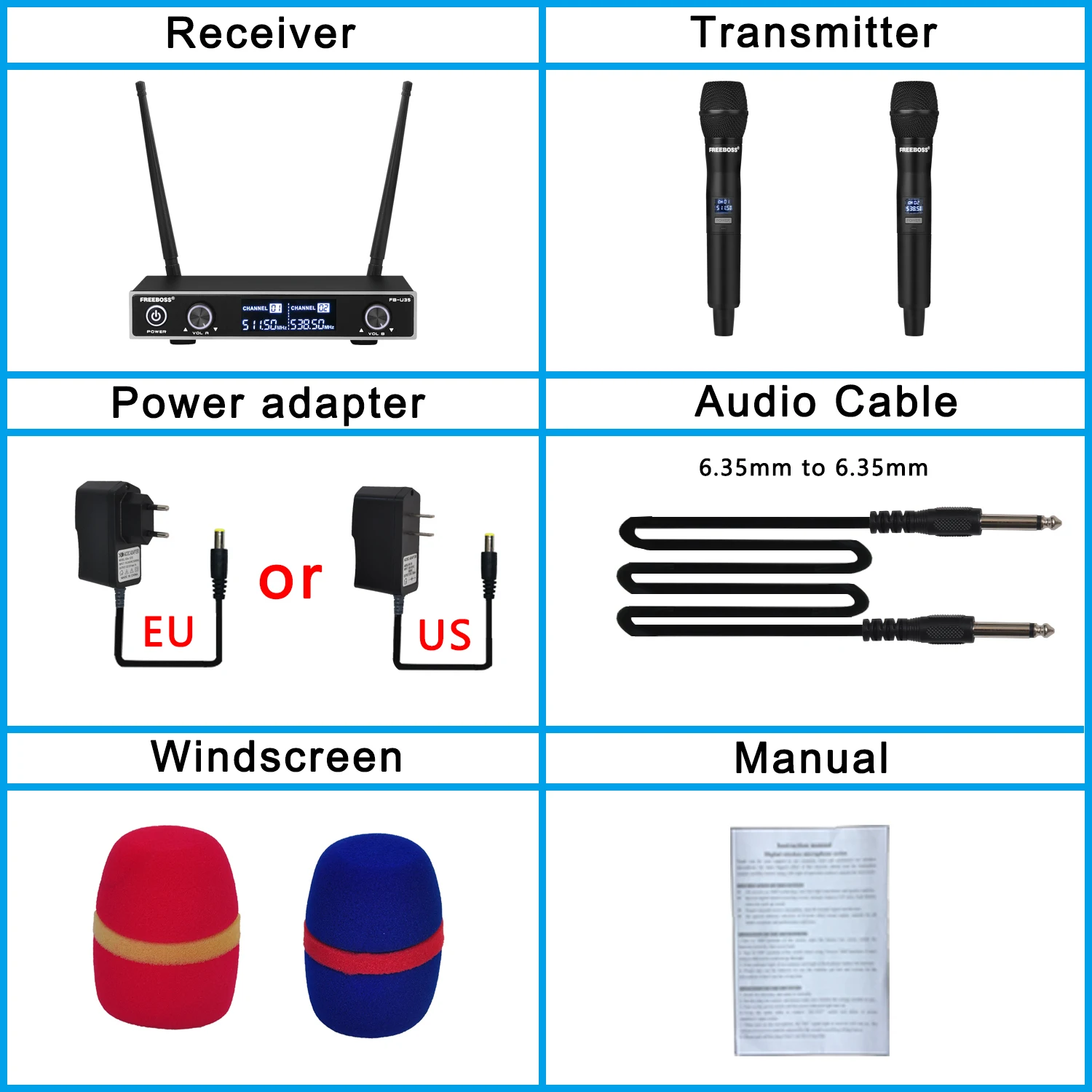 1. Пункт продажи:1) фиксированная частота диапазона УВЧ2) Передатчик: 2 шт Пластиковые ручные микрофоны3) Приемник: металлическая коробка, кнопка вкл/выкл, индивидуальная Ручка громкости, радиочастотный индикатор4) два отдельных выхода XLR и один смешанный выход 1/4 ".5) диапазон: до 98 футов (более 30 метров), подходит для караоке, выступлений, вечерние, церковные и т. Д.6) Батарея: 2*2*1,5 АА (не входит в посылка.)