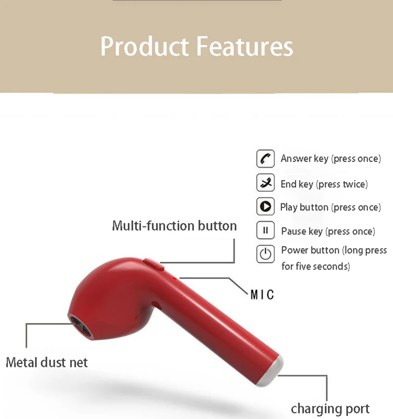Примечание: у этого продукта Нет коробки для розничной упаковки! Особенности: 1. Прослушивание правильной песни, поддержка песен и звонков, 2. Напоминаем номер звонка, последний звонок назад, все интеллектуальные китайские и английские голосовые подсказки, загрузка, пара, отключение питания телефона будет низким голосовым подсказкой; 3. Мощность будет отображаться на вашем Iphone, вы можете видеть ситуацию с питанием в любое время, не беспокойтесь о электричестве, Сделайте свою жизнь без беспокойства; 4. Одно-два подключения, можно подключить к двум мобильным телефонам одновременно 5. Bluetooth-гарнитура, подключенная к телефону после выключения, а затем откройте bluetooth-гарнитуру, автоматически подключится к телефону, что более удобно; 6. Интеллектуальная Совместимость: Поддержка всех Bluetooth мобильный телефон, планшет, ноутбук, пение, QQ музыка, фильмы и т. Д., универсальный мобильный телефон Спецификация: 1. Драйвер: 15 мм 2. Сопротивление: 32 Ом 3. Версия Bluetooth: Bluetooth v5.0 + EDR 4. Диапазон использования Bluetooth: 2,4 ГГц 5. Уровень мощности: класс II 6. Выходная мощность: 30 мВт 7. Расстояние Bluetooth: 10 метров барьер 8. Частотная характеристика: 20-20000 Гц 9. Диапазон рабочего напряжения: 3,0-4,2 В 10. Чувствительность микрофона: -42 дБ 11. С A2DP / AVRCP высокое качество стерео аудио передача и протокол дистанционного управления 12. Мощная Схема шумоподавления (активное шумоподавление) 13. Переключение между китайским и английским (загрузка не подключается к Bluetooth, нажмите переключатель 2 раза, услышите тон переключатель успешно) 14. Время разговора составляет около 2-3 часов 15. Время прослушивания музыки около 1,5-2 часов 16. Время работы в режиме ожидания составляет около 100 часов Посылка включает в себя: 2 x i7s tws bluetooth наушники (левый и правый наушники) 1 x Зарядное устройство 1 х USB кабель для зарядки 1 x Руководство пользователя