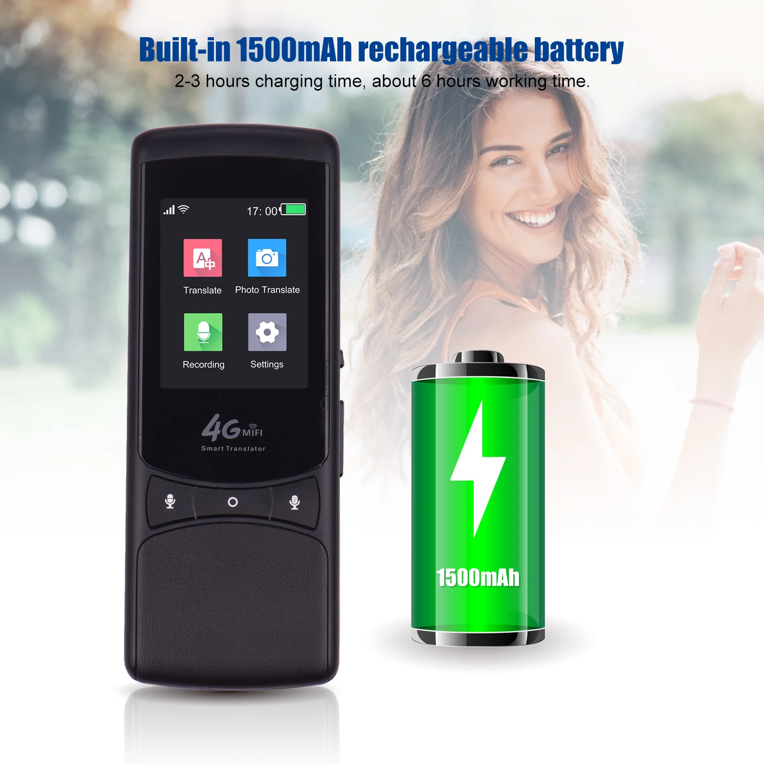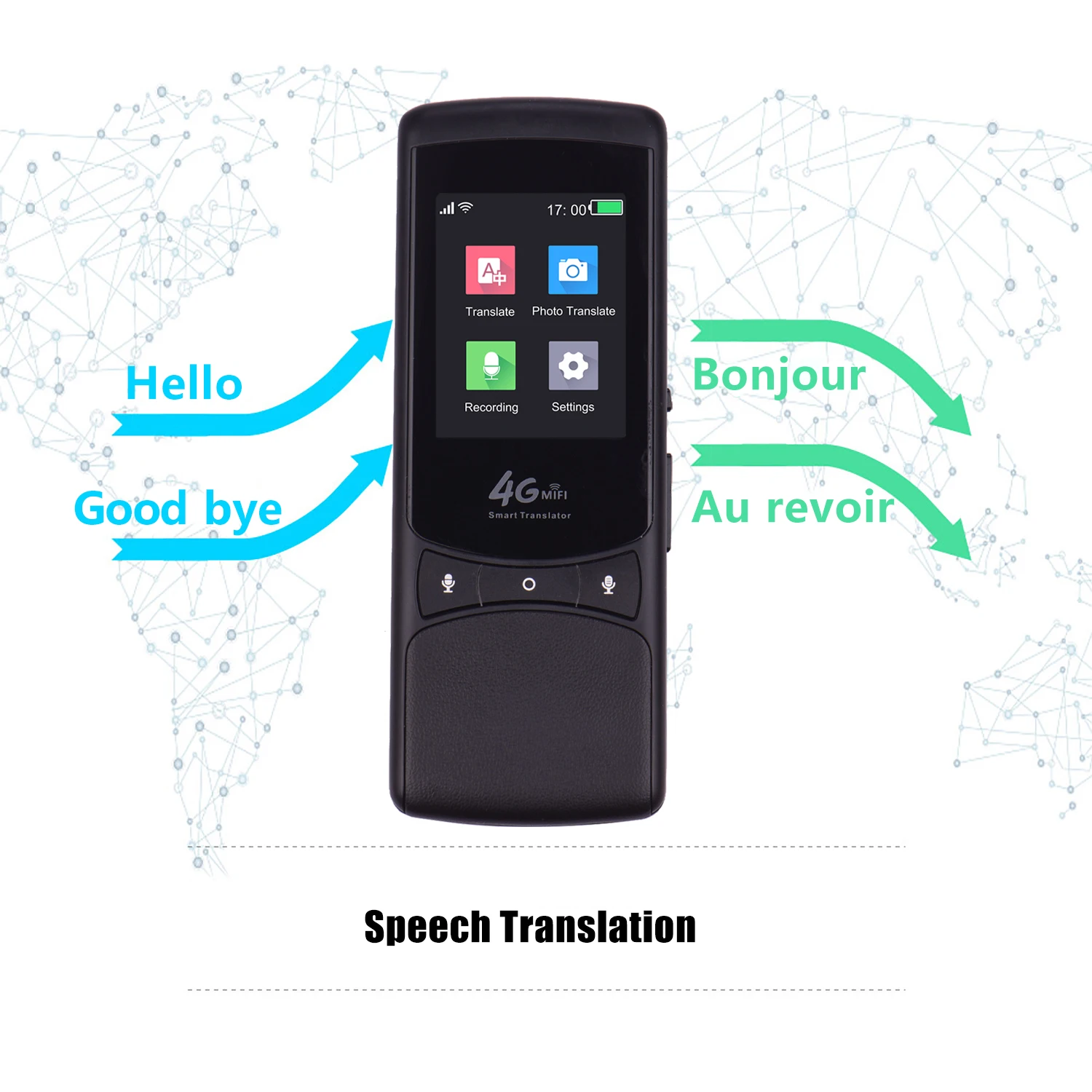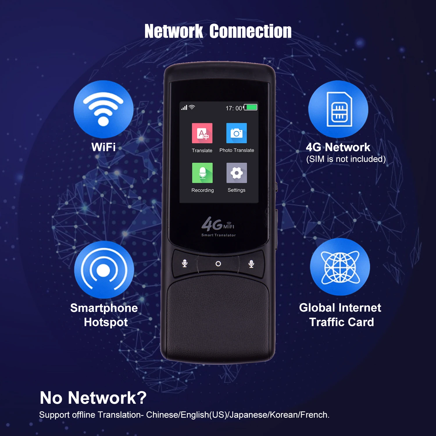 Несколько способов сети и поддержки MiFi:Нет необходимости устанавливать какое-либо приложение. Поддерживает подключение к сети WiFi/4G (SIM не входит в комплект)/Глобальная карта Интернет-трафика. Больше не попадать в неприятности при поездке за границу или общении с иностранцами. Переводчик оснащен мобильной точкой доступа, когда вы вставляете sim-карту, он может обеспечить Wi-Fi на ваш мобильный телефон или ноутбук, необходимый для поездок за границу и бизнеса.
