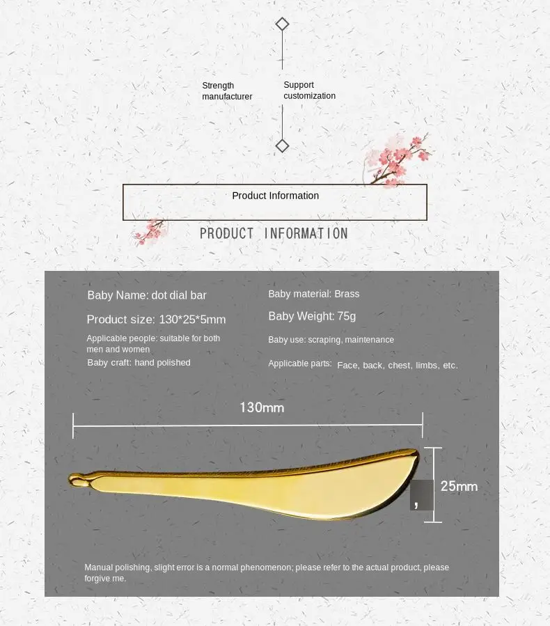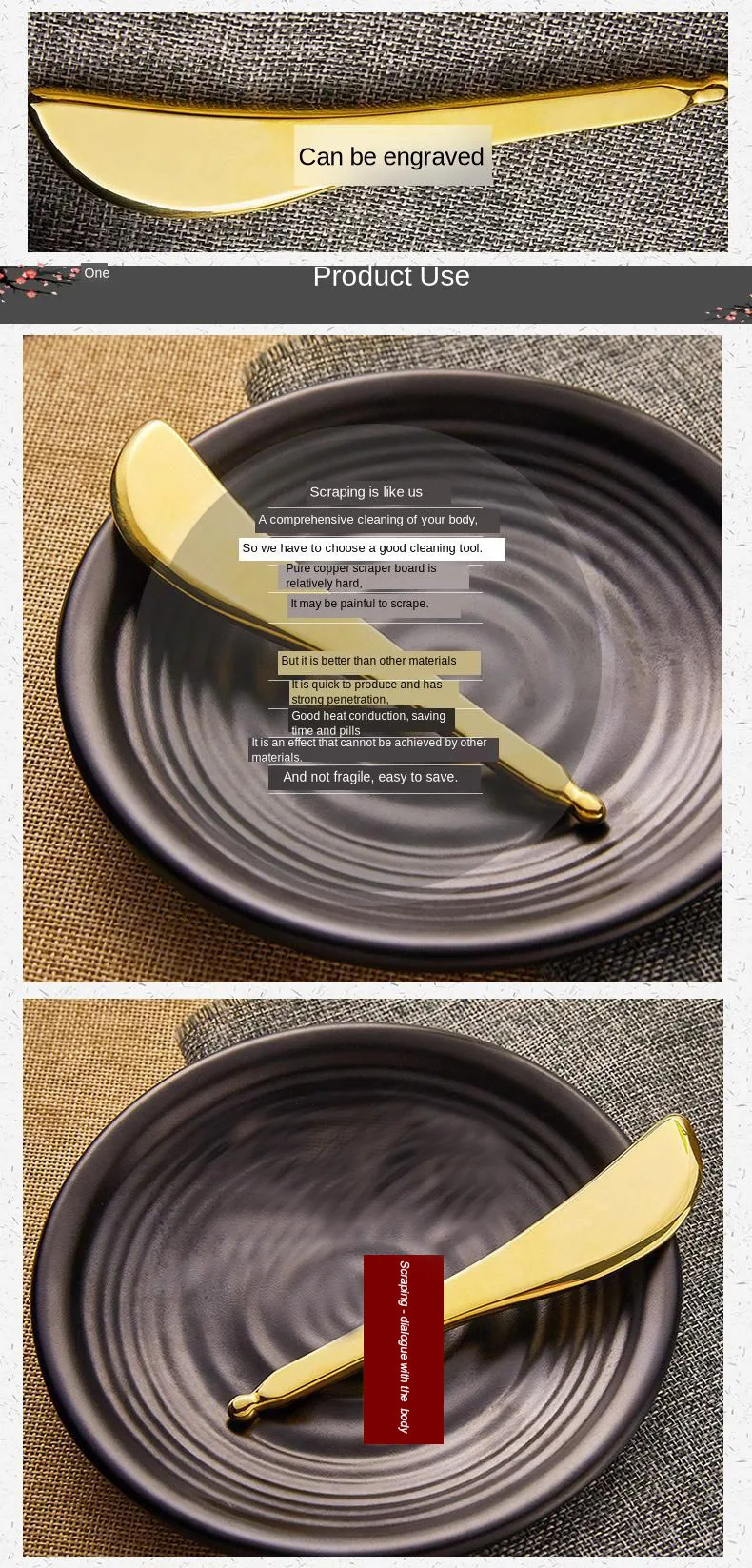 Соскабливание-это как тщательная очистка собственного тела нашей команды, поэтому мы должны выбрать хороший инструмент для очистки. Чистые медные скребковые доски тяжелее и могут быть более болезненными для скребки. Тем не менее, он быстрее, чем другие материальные пластины, обладает сильной проникающей мощностью, хорошей теплопроводностью, экономит время и силы, и является эффектом, который другие материалы не могут достичь. Он не хрупкий и легко хранить.