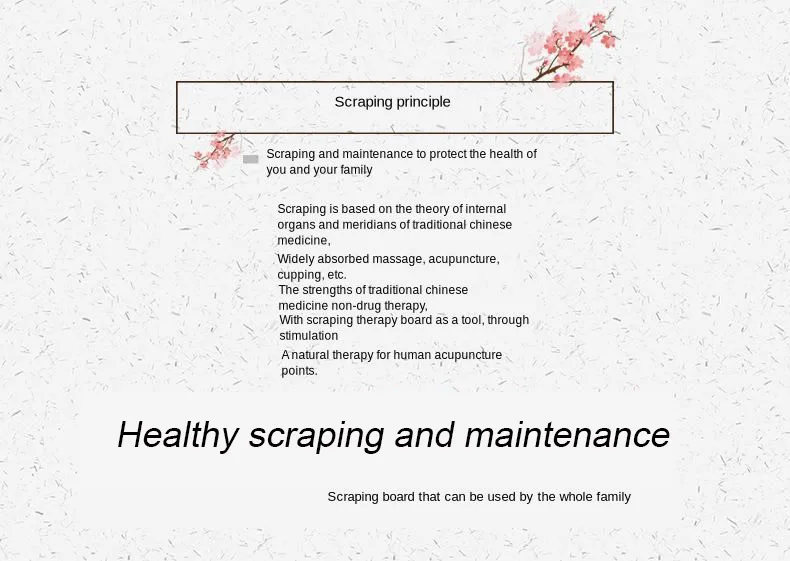 Соскабливание основано на теориях виссеры и меридианов традиционной китайской медицины. Он поглощает преимущества традиционной китайской медицины нелекарственной терапии, такой как массаж, акупунктура и баночка, и использует Очищающая терапия доска как инструмент для стимуляции акупунктурных точек.