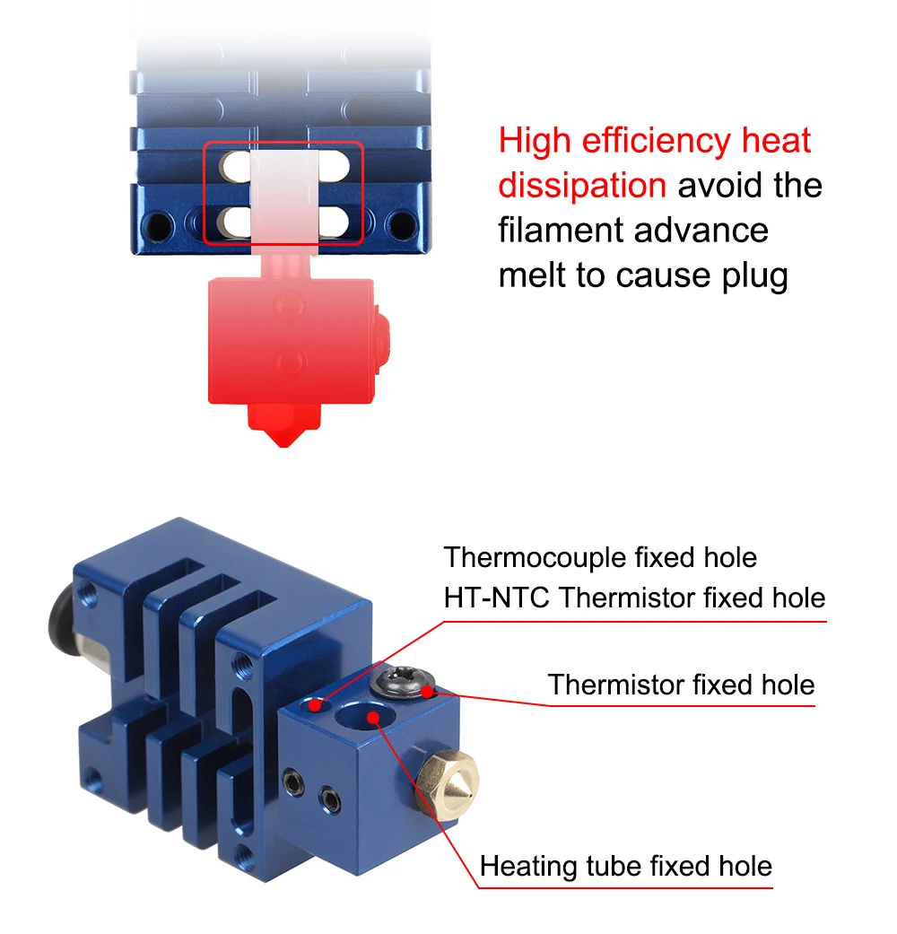 Примечание:Высокая температура. Тип также может печатать нить PLA, но поскольку трубка внутри полностью металлическая, а теплопроводность хорошая, что позволяет легко нагревать всю трубку, И в результате материал будет плавиться заранее, а затем происходит сцепление. Поэтому, если вы печатаете PLA с высокой температурой. Наберите, вы должны хорошо установить температуру. Если только или обычно для печати PLA, рекомендуется сквозной тип подачи.