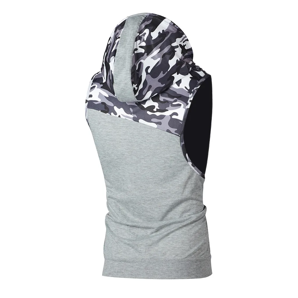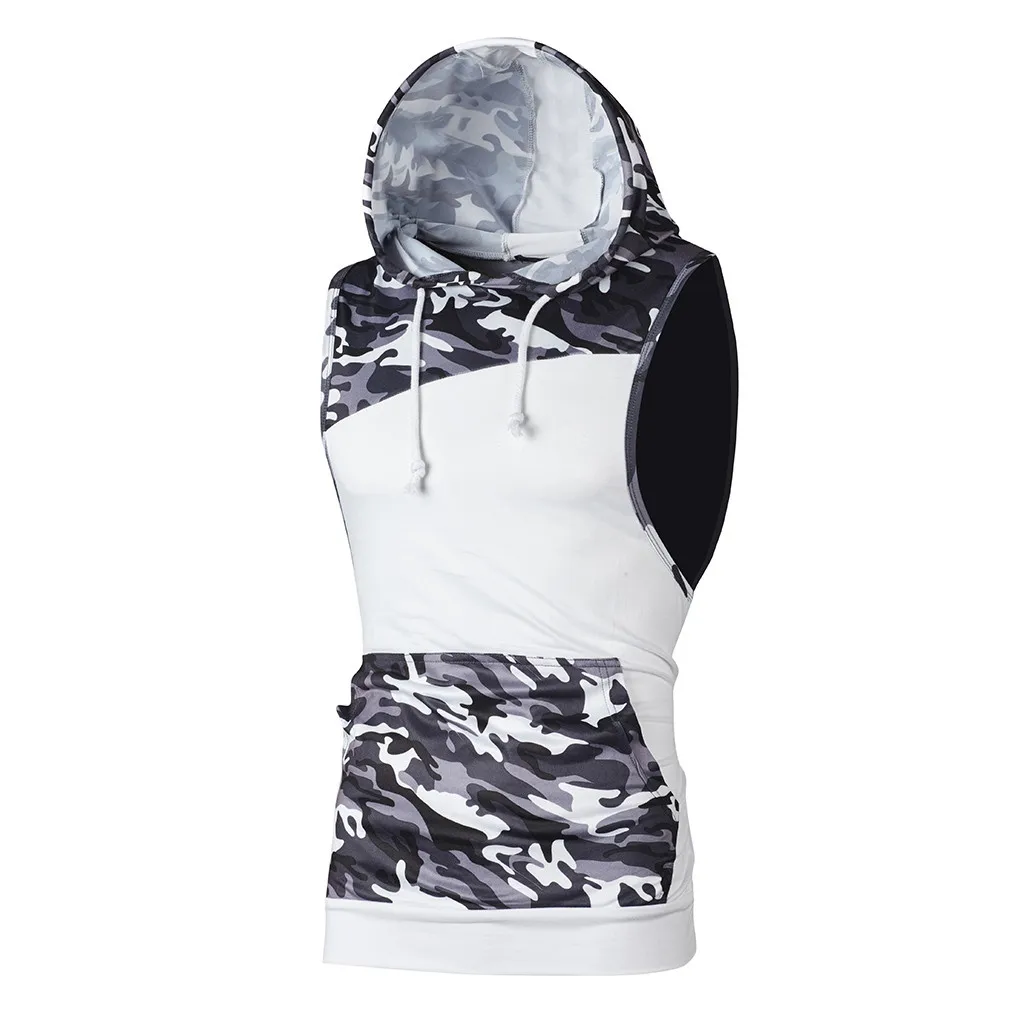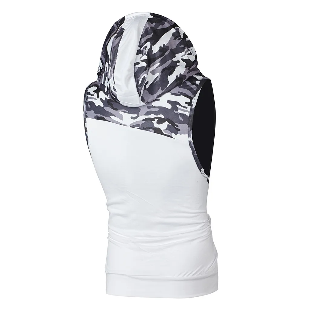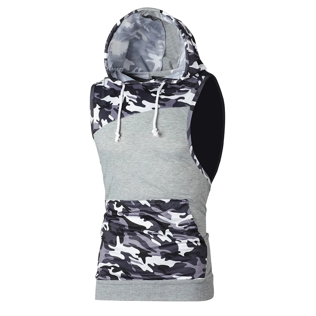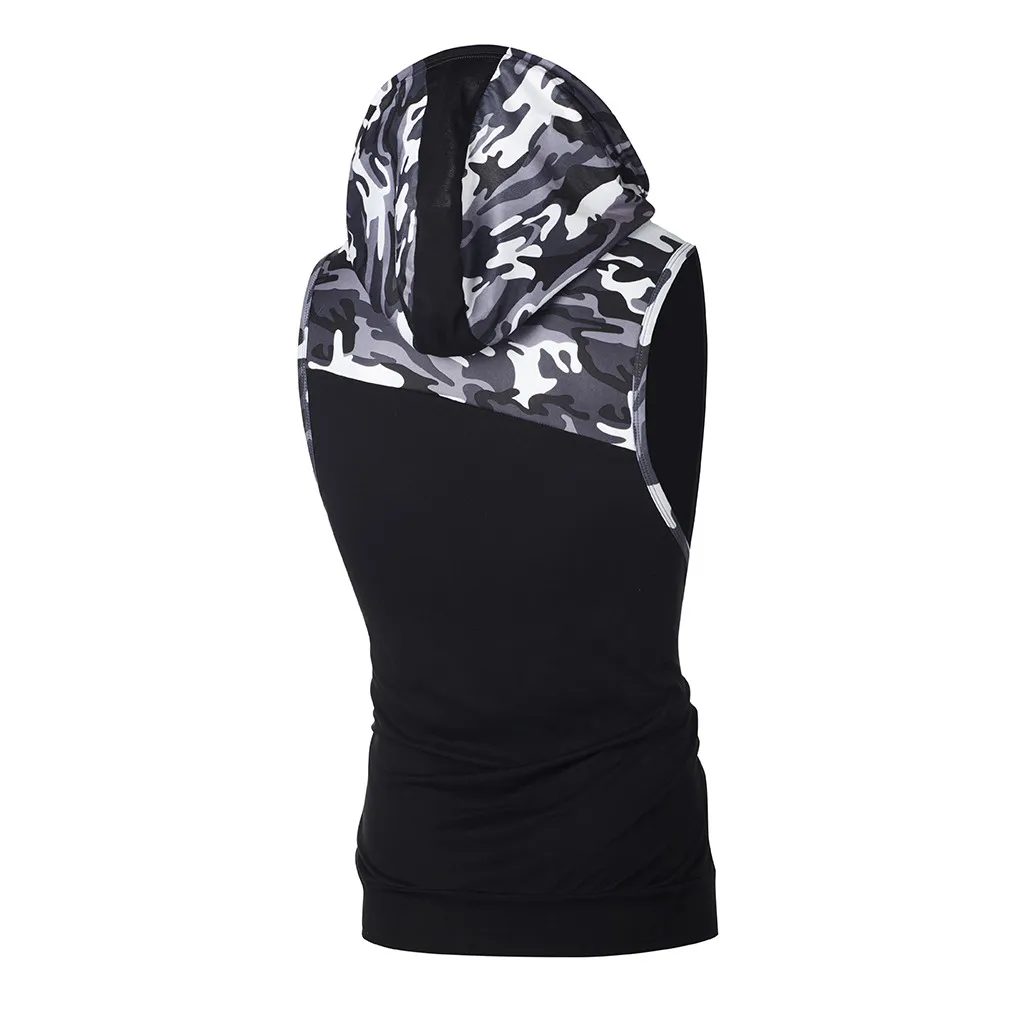 Мужская Летняя камуфляжная Лоскутная футболка без рукавов, топы на бретелях, блузка с капюшоном