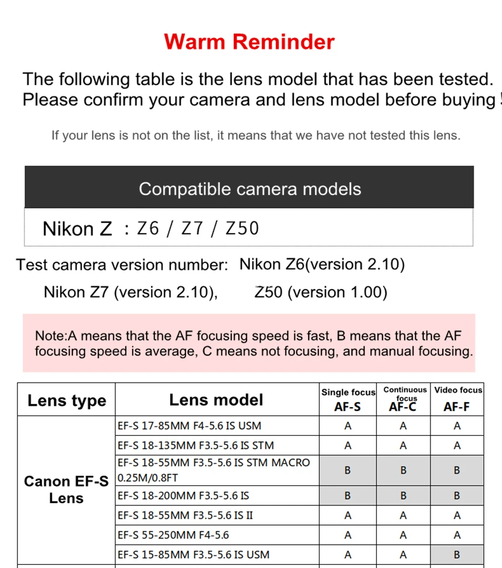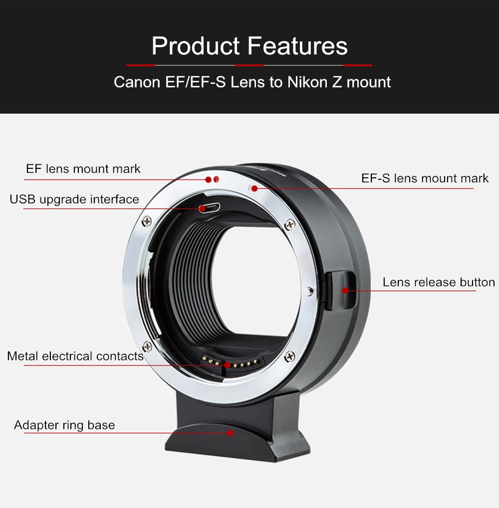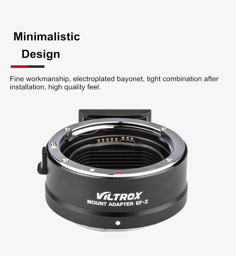 Адаптер объектива Viltrox EF-Z-это электронный адаптер для объективов Canon EF/ EF-S для камер NikonZ-Mount. Адаптер не только для достижения высокоскоростного автоматического фокуса, но и для добавления к функции обновления прошивки USB. Между тем, он реализует Автофокус AF и возможность переключения фокусировки глаз, что не только расширяет создание и ценность объектива, кроме того, это позволяет владельцам камеры Z-Mount иметь больше выбора.