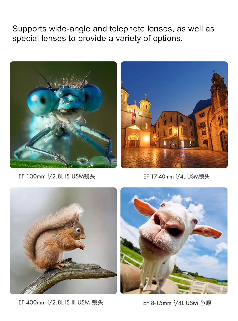 Обновление прошивки USB; Супер высокоскоростная функция автофокуса; Передача информации EXIF; Электронное управление диафрагмой; Поддержка объектива является функцией стабилизации; Позолоченные контактные булавки для отличной проводимости; Съемная 1/4 нижняя базовая пластина штатива; Обработка ЧПУ с алюминиевым сплавом;