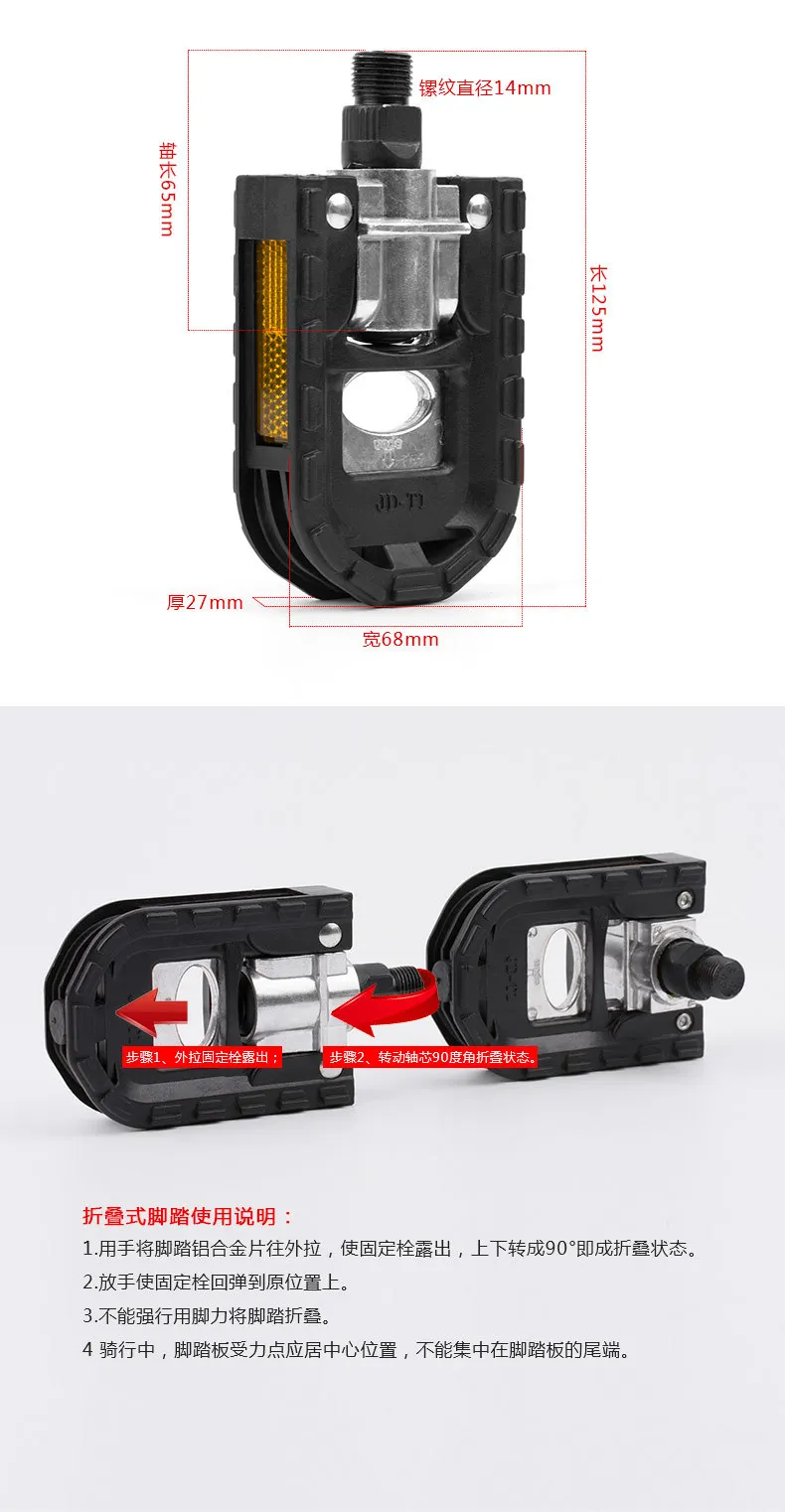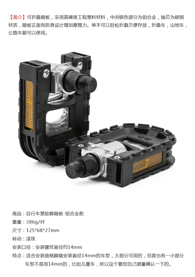 [Введение] Складная Педаль изготовлена из высокопрочного инженерного пластикового материала, Серебряная часть в середине-алюминиевый сплав, сердечник вала изготовлен из углеродистой стали, И противоскользящая конструкция на передней части педали Увеличивает трение. Его можно легко сложить и хранить одной рукой. Можно использовать складной велосипед, горный велосипед и дорожный велосипед