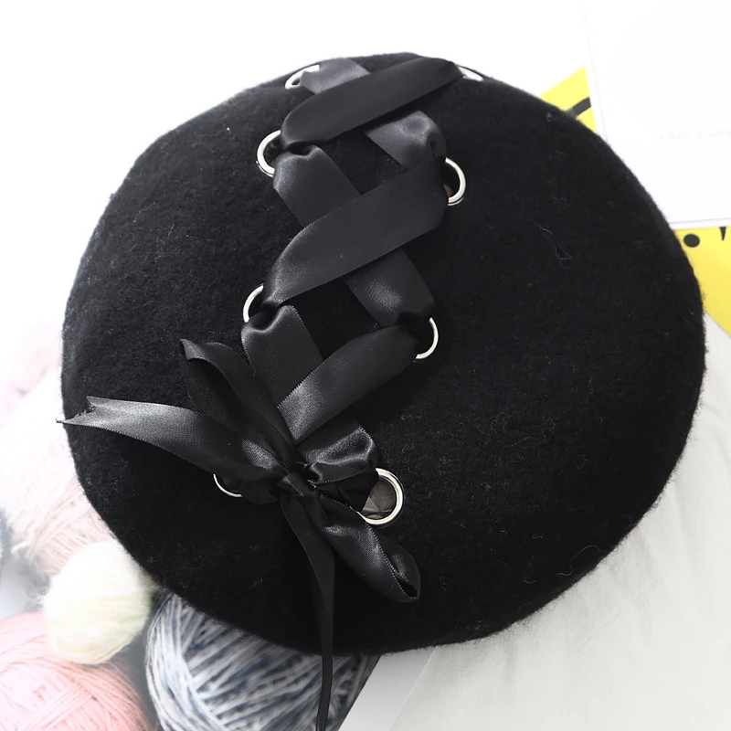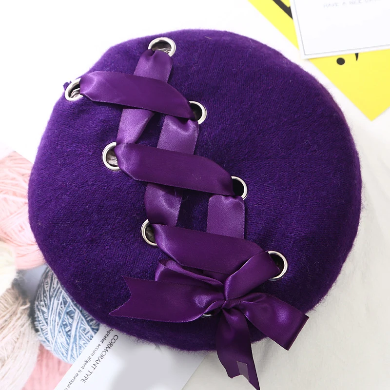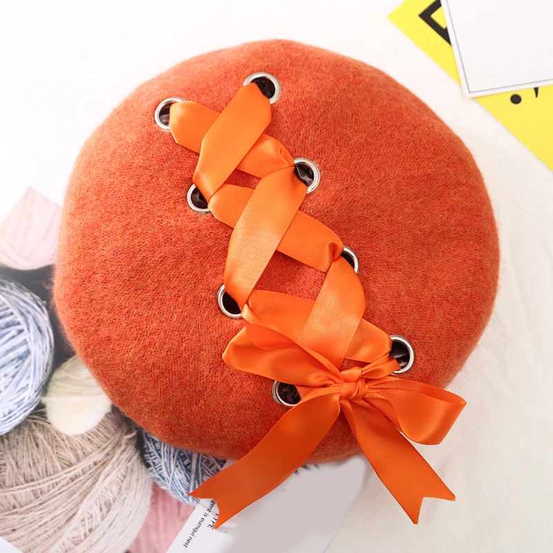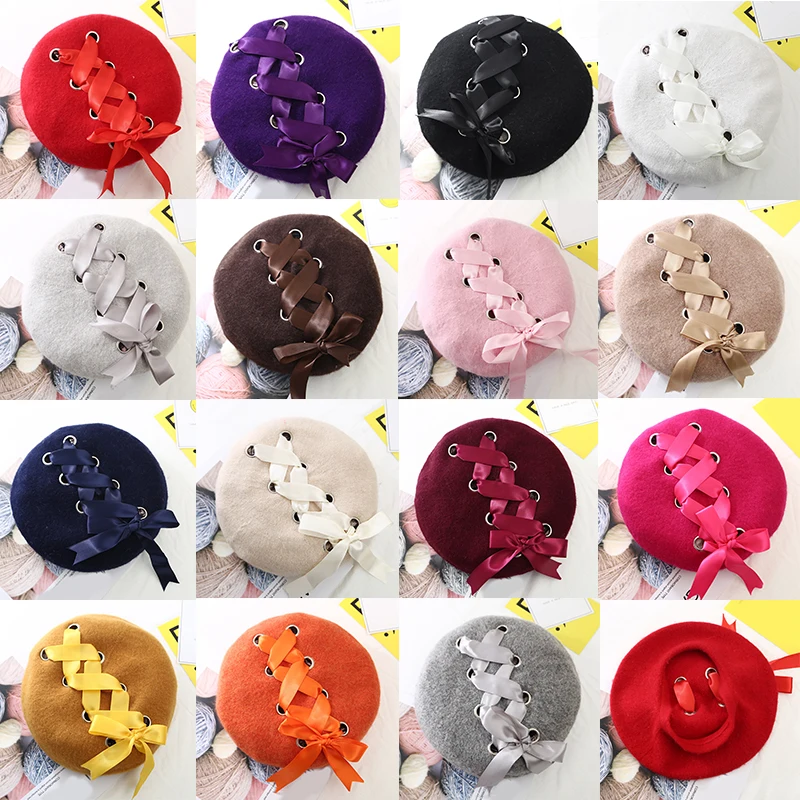 Женский зимний шерстяной берет со шнуровкой и бантиками, винтажная теплая однотонная Кепка художника