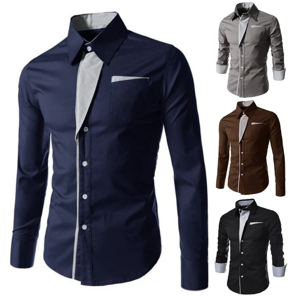 Модная мужская рубашка с воротником-стойкой, с длинным рукавом, с цветным блоком, на пуговицах, облегающий Топ