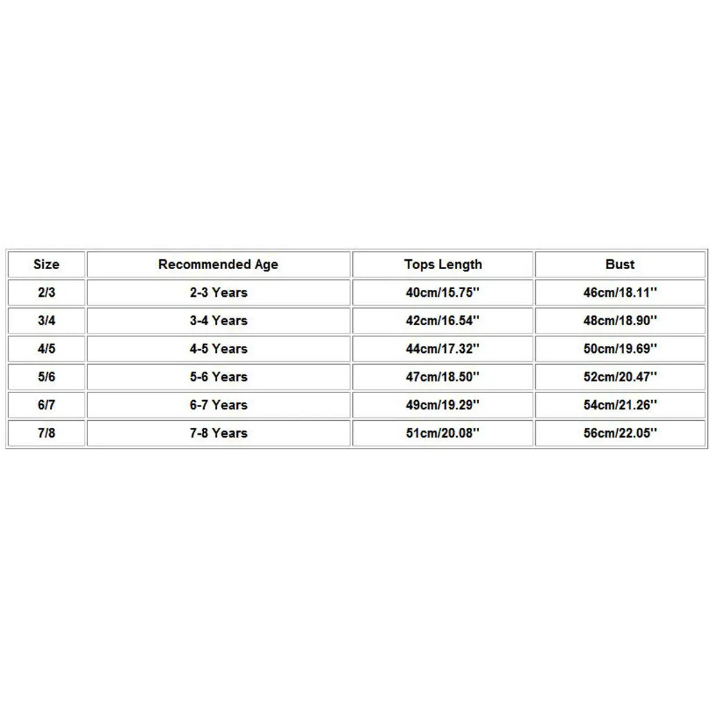 Размеры Рекомендуемый возраст Топы Длина Обхват груди 2/3 От 2 до 3 лет 40 см/15,75'' 46 см/18,11'' 3/4 От 3 до 4 лет 42 см/16,54'' 48 см/18,90'' 4/5 От 4 до 5 лет 44 см/17,32'' 50 см/19,69'' 5/6 От 5 до 6 лет 47 см/18,50'' 52 см/20,47'' 6/7 От 6 до 7 лет 49 см/19,29'' 54 см/21,26'' 7/8 От 7 до 8 лет 51 см/20,08'' 56 см/22,05''