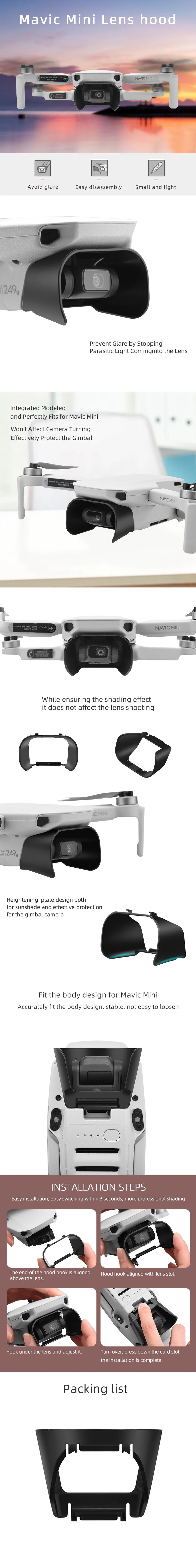 Чехол для объектива солнцезащитный чехол для dji mavic mini/mini 2 бленда для объектива антибликовый карданный защитный чехол для камеры DJI Mavic Mini/Mini 2 аксессуары Характеристика: 1. Подходит для DJI Mavic Mini объектив для беспилотника, 2. Может эффективно предотвратить попадание паразитарного светильник в объектив и избежать отражения, 3. Быстрая установка и удаление, стабильная без ослабления, 4. Светильник весит без добавления веса к дрону. Описание: Материал: АБС-пластик Применимые модели: для DJI Mavic Mini/Mini 2 Цвет: черный Вес нетто: 5,2 г Размер продукта: 5,6*3,6*3,4 см Упаковочный лист: 1 шт. бленда для объектива Примечание: Дрон в комплект не входит.