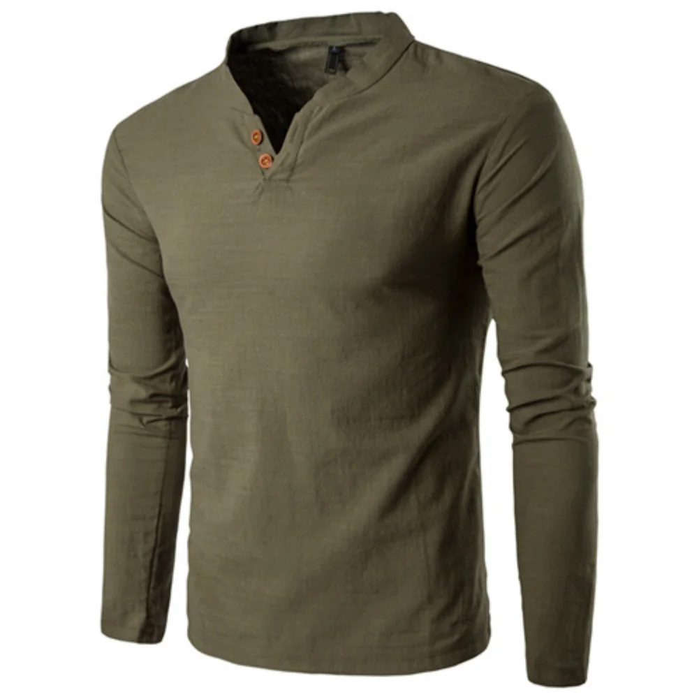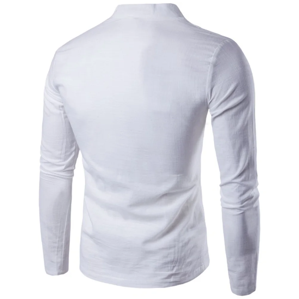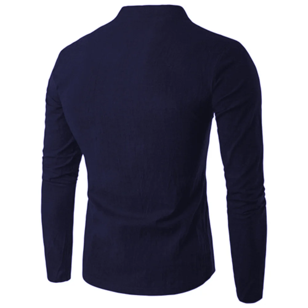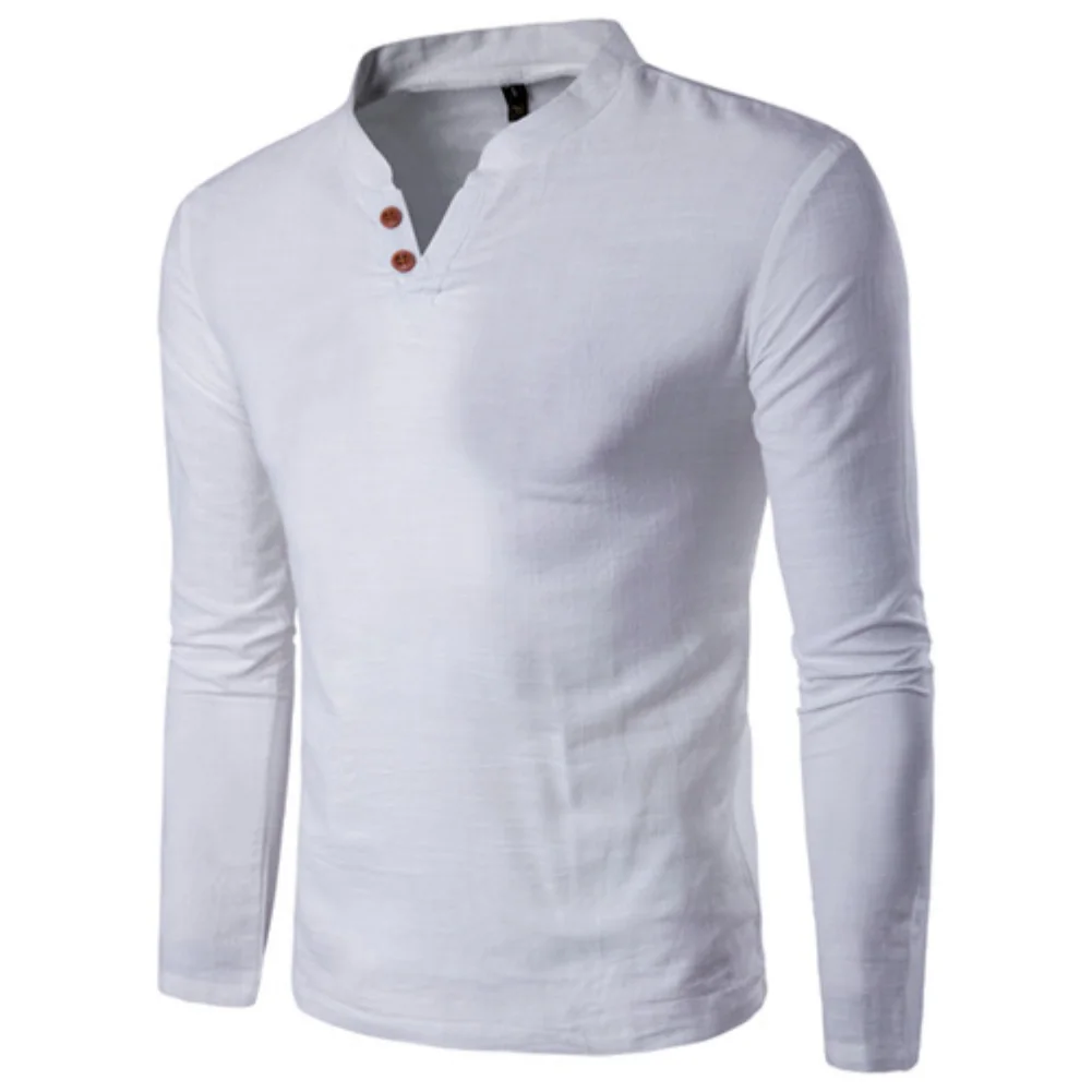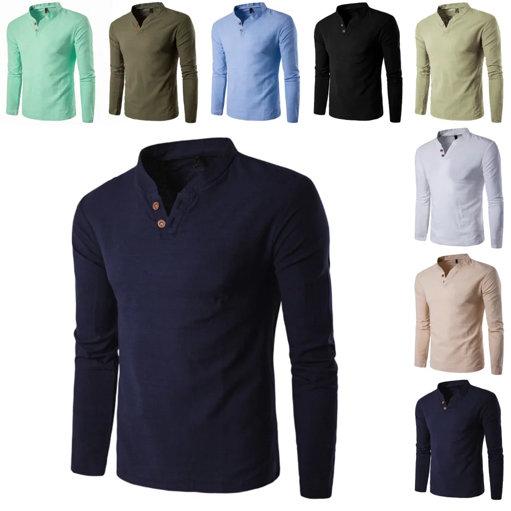 Мужская хлопковая льняная рубашка в китайском стиле с пуговицами и v-образным вырезом, длинным рукавом и воротником-стойкой