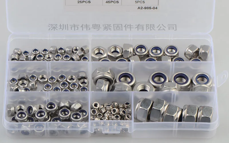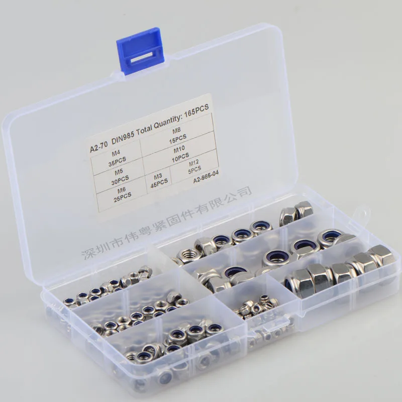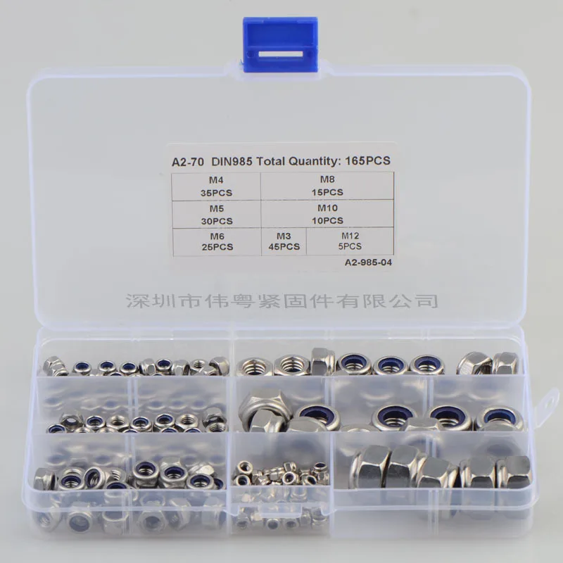 Размер коробки: около 17,6*10,2*2,3 см 165 шт M3 M4 M5 M6 M8 M10 M12 нержавеющая сталь 304 DIN985 нейлон Шестигранная гайка комбинированный набор A2-985-04 M3 45 шт M4 35 шт M5 30 шт. M6 25 шт M8 15 шт. M10 10 шт. M12 5 шт.