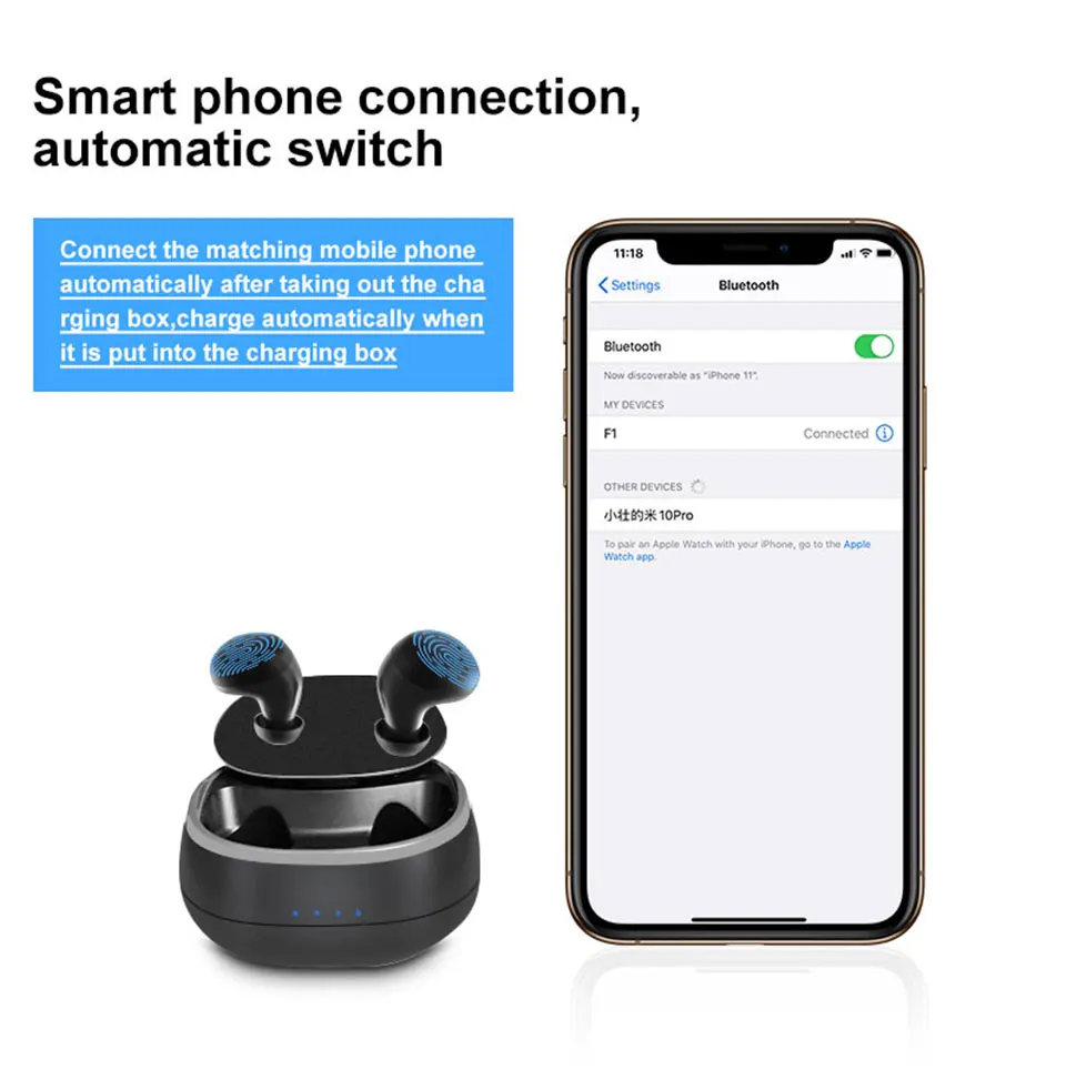Шаг 1: Извлеките наушники из зарядный чехол, он автоматически включится или коснется кнопки MFB в течение 1 секунды, чтобы включить наушник, светодиодная индикация светильник будет начнет мигать синим в течение 5 секунд, а затем вспыхивают в красном и синем цветах. Шаг 2: активируйте функцию Bluetooth на вашем устройстве и выполните поиск F1. Шаг 3: Нажмите F1, чтобы завершить подключение, вы услышите, что подключено, и светодиодный светильник выключится.