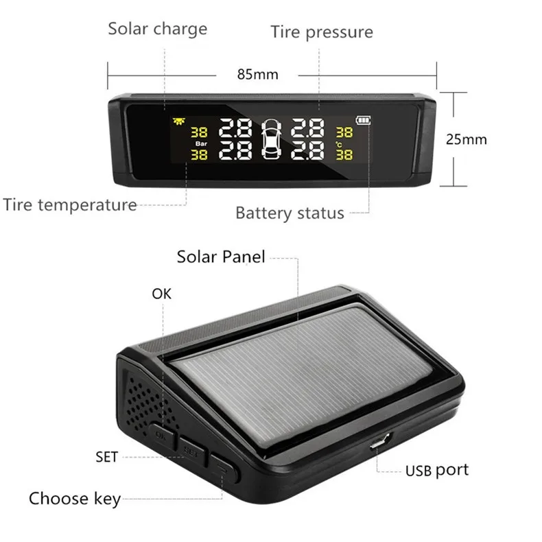 Вам нужно только установить датчик на шину, подождите около 1 минуты, и вы увидите, что на дисплее отображается давление и температура шины.1 + 1 режим зарядкиСолнечная зарядка + USB зарядка