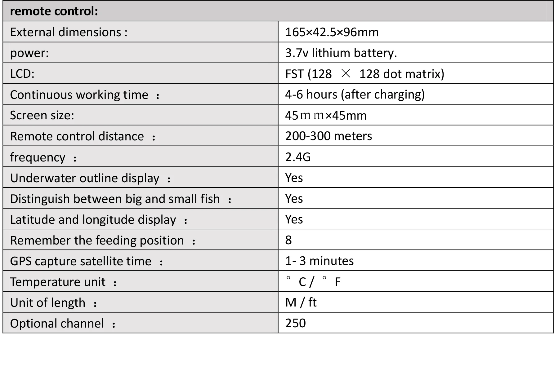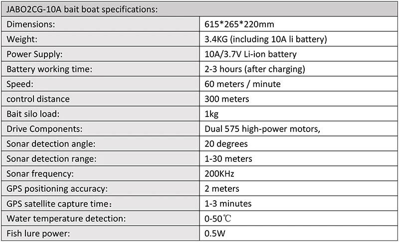 JABO2CG Автоматическая навигация интеллектуальная конфигурация гнездового сосуда: гнездовой сосуд * 1, пульт дистанционного управления * 1, зарядное устройство * 1, руководство на английском языке * 1, 3,7V36A литиевая батарея * 1 Модель: JABO2CG-10A, JABO2CG-20A, JABO2CG-36A Основные функции и особенности JABO-2CG лодки-приманки: 1.JABO2CG имеет точное позиционирование и точную навигацию. Позиционирование, радиус навигационной ошибки составляет менее 5 метров, ошибка в основном находится в пределах 2 метров при тестировании 2.JABO2CG может хранить 8 гнезд. Как только гнезда мишени будут идентифицированы впервые, они могут быть вложены (отпущены) в радиусе 1000 метров на одной поверхности и в разных местах рыбалки. Это может обеспечить точное позиционирование и увеличить рыболовные Весы. Шанс большего количества рыбалки также экономит ресурсы приманки и увеличивает удовольствие от рыбалки. Особенно в случае ночной рыбалки, обычное катание на лодках не может достичь точного склеивания (Бесплатная фиксация). Даже если ночью нет лунного света, JABO2CG можно использовать для коррекции гнезд (отпускание крючков). 3. Рабочая частота JABO2CG 2,4g, может быть установлена до 250 частотных точек, что позволяет одновременно использовать несколько военных кораблей в одной и той же рыбацкой местности. 4. Каждый раз, когда используется JABO2CG, отправная точка может быть установлена вручную (автоматически). После успешной установки исходной точки военный корабль может безопасно вернуться в «Дом» после каждого отправления. JABO2CG также автоматически устанавливает начальную точку, когда отправная точка не установлена вручную. Поскольку требуется время для автоматического установки исходной точки для получения спутникового позиционирования, отправная точка автоматической настройки может быть относительно высокой. 5. Каждый раз, когда переключатель питания корабля включен, стыковочный Экипаж автоматически начнет устанавливать контакт с навигационными спутниками. Обычно это занимает от 0,5 до 5 минут, чтобы создать успешном подключении. 6. Уникальный дизайн автоматического силоса лодки приманки имеет то преимущество, что лопастные гнезда можно визуально наблюдать, и силос приманки автоматически сбрасывается, чтобы работать более плавно. Эти функции еще более выражены после автоматической навигации. 7. Силовая часть лодки приманки непосредственно управляется двойным 575 двигателем с высокой мощностью плюс универсальным соединением, которое реализует бесшумный привод. Улучшая структурную конструкцию коробки передач двигателя, она также значительно уменьшает шум во время работы Скипа. 8. Конструкция встроенного пропеллера перекрывает дефект, который внешний пропеллер легко запускать с посторонними материалами. Он подходит для использования в тех случаях, когда на воде есть водные растения и плавающие предметы, а также продлевает срок службы пропеллера. 9 для того, чтобы быть подходящим для ночной работы, на корабле установлены два навигационных светильника разных цветов. Ночью оператор может контролировать и распознавать направление навигации судна в соответствии с различными цветами индикаторных огней. В то же время для облегчения ночной рыбалки JABO2CG оснащен ночным светильник, который можно дистанционно управлять. 10.JABO2CG имеет функцию поиска рыбы, измерения глубины воды, привлеч
