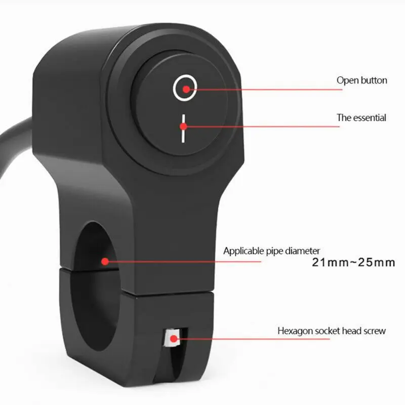 Совершенно новый и высококачественный. Подходит для всех мотоциклов, мотоциклов, скутеров на аккумуляторах 12 В. Защита от выходных замыканий, защита от перегрузки, защита от полярности, многократная защита, безопасность в использовании. Цвет корпуса сделан из анодированной пескоструйной обработки. Этот продукт оснащен индикаторным светильник. Когда переключатель включен, светильник индикатора будет включаться, или светильник индикатора будет выключен. Характеристики: Цвет: черный класс водонепроницаемости: IP65 Вес: 90 г диаметр: 22 мм длина: 56 мм Ширина: максимум 24,6 мм, самый маленький 13,8 мм Длина кабеля: около 60 см Мощность: 120 Вт (макс.) ток: 10 А напряжение: 12 В электрическое: вкл. ВЫКЛ. Чехол Материал: алюминиевый сплав. Диаметр монтажного кронштейна, подходящего для ручки: 22-23 мм/0,78-0,90 дюйма