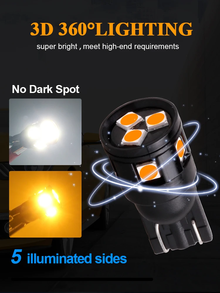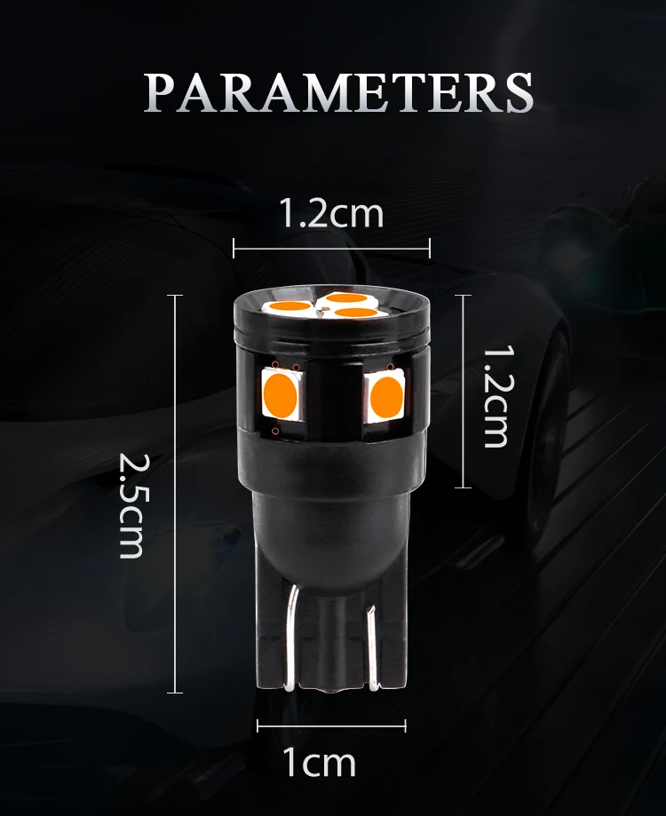 Диапазон напряжения: 12-24 В постоянного тока Мощность: 5 Вт Тип основания: T10 Люмен: 150 лм Чип: 8 шт. 3030SMD чипы Цвет светильника: белый, желтый В комплект входит: 2 шт. T10 автомобильный сигнал поворота