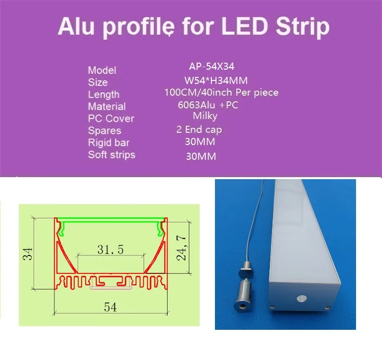 Спецификация: * Номер товара: AP-54X34 * Размер: l1000xw54xh34мм * Материал: алюминиевый корпус + крышка ПК * Ширина печатной платы: 30 мм Аксессуары: 1. Корпус светодиодного алюминиевого профиля: 100 см/комплект * 10-20 комплектов 2. Заглушка: 2 шт./компл. * 10-20 комплектов 3. Крышка ПК: молочная крышка ПК 100 см/комплект * 10-20 комплектов 4. Педант веревка-только вариант молочный профиль с веревкой имеет 2 шт./компл. * 10-20 комплектов Другая длина может быть изменена, если у вас есть требования к настройке, пожалуйста, свяжитесь с продавцом Полоска не входит в комплект, ее нужно покупать отдельно