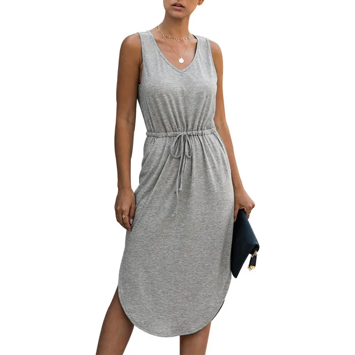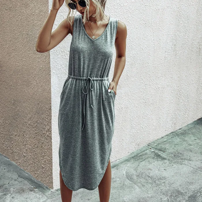 Тип одежды: женское однотонное тонкое платье без рукавов с поясом и v-образным вырезом; Летние праздничные платья